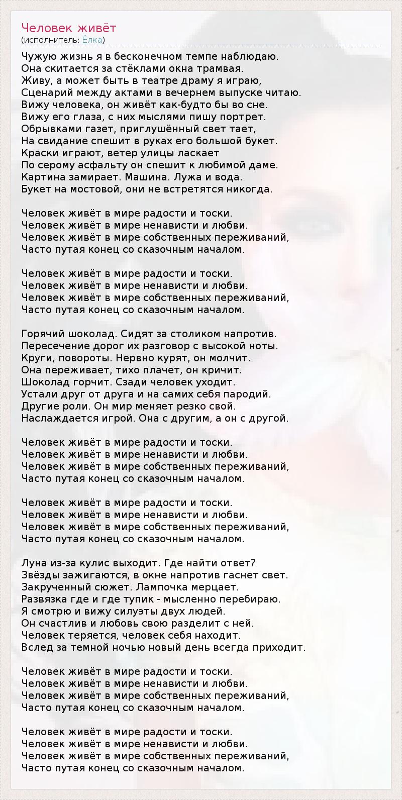 Чужую жизнь я в бесконечном темпе наблюдаю. Она скитается за стёклами окна трамвая. Живу, а может быть в театре драму я играю, Сценарий между актами в вечернем выпуске читаю. Вижу человека, он живёт как-будто бы во сне. Вижу его глаза, с них мыслями пишу портрет. Обрывками газет, приглушённый свет тает, На свидание спешит в руках его большой букет. Краски играют, ветер улицы ласкает По серому асфальту он спешит к любимой даме. Картина замирает. Машина. Лужа и вода. Букет на мостовой, они не встретятся никогда. Человек живёт в мире радости и тоски. Человек живёт в мире ненависти и любви. Человек живёт в мире собственных переживаний, Часто путая конец со сказочным началом. Человек живёт в мире радости и тоски. Человек живёт в мире ненависти и любви. Человек живёт в мире собственных переживаний, Часто путая конец со сказочным началом. Горячий шоколад. Сидят за столиком напротив. Пересечение дорог их разговор с высокой ноты. Круги, повороты. Нервно курят, он молчит. Она переживает, тихо плачет, он кричит. Шоколад горчит. Сзади человек уходит. Устали друг от друга и на самих себя пародий. Другие роли. Он мир меняет резко свой. Наслаждается игрой. Она с другим, а он с другой. Человек живёт в мире радости и тоски. Человек живёт в мире ненависти и любви. Человек живёт в мире собственных переживаний, Часто путая конец со сказочным началом. Человек живёт в мире радости и тоски. Человек живёт в мире ненависти и любви. Человек живёт в мире собственных переживаний, Часто путая конец со сказочным началом. Луна из-за кулис выходит. Где найти ответ? Звёзды зажигаются, в окне напротив гаснет свет. Закрученный сюжет. Лампочка мерцает. Развязка где и где тупик - мысленно перебираю. Я смотрю и вижу силуэты двух людей. Он счастлив и любовь свою разделит с ней. Человек теряется, человек себя находит. Вслед за темной ночью новый день всегда приходит. Человек живёт в мире радости и тоски. Человек живёт в мире ненависти и любви. Человек живёт в мире собственных переживаний, Часто путая конец со сказочным началом. Человек живёт в мире радости и тоски. Человек живёт в мире ненависти и любви. Человек живёт в мире собственных переживаний, Часто путая конец со сказочным началом.