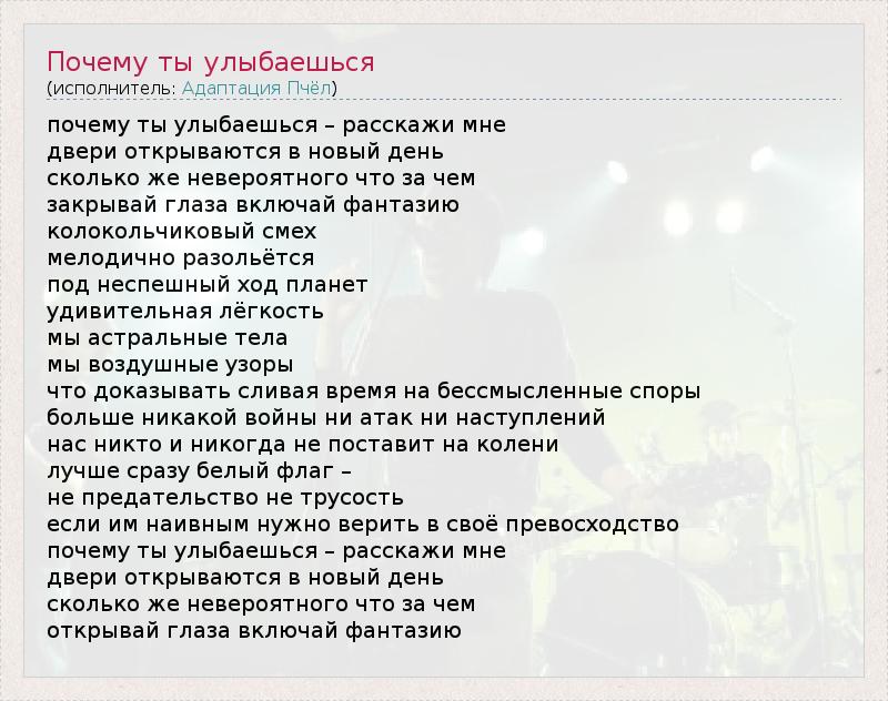 ГлавнаяИсполнителиАдаптация ПчёлПочему ты улыбаешься