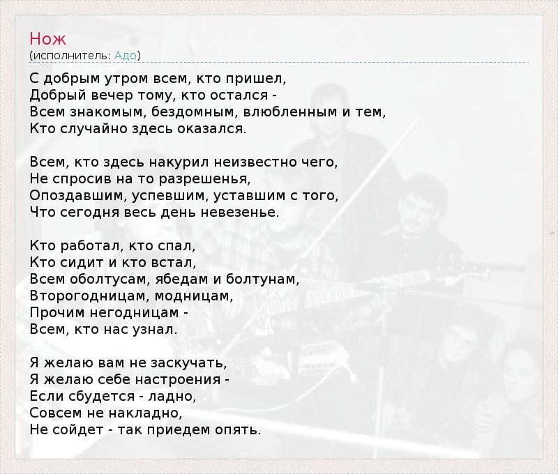 Это интересно:«Адо́» — российская рок-группа, образовавшаяся в 1988 году в подмосковном городе Коломна (немного позже группа практически стала московской). Бессменный лидер и автор песен — Андрей Горохов, выпускник МВТУ им. Баумана.«Адо́» исполняет мелодичный рок, с яркими образными текстами. В записи некоторых песен участвовали Константин Никольский, Олег Сакмаров и другие приглашённые... продолжение