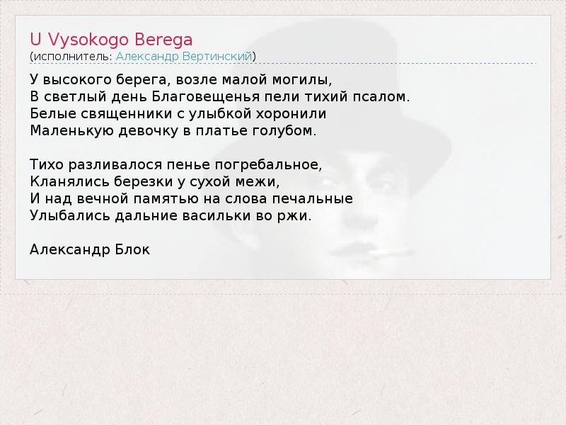 Это интересно:Александр Вертинский родился в Киеве 9 (21) марта 1889 года. Здесь же прошло его детство.Его отец, адвокат, не был официально женат на его матери, так как ему не давала развода первая жена. После смерти матери отцу пришлось "усыновить" детей. Сестра Надя осталась жить у отца, а Александра отдали тетке, Марье Степановне, сестре матери. Отец очень тяжело переживал смерть жены. Вскоре он... продолжение