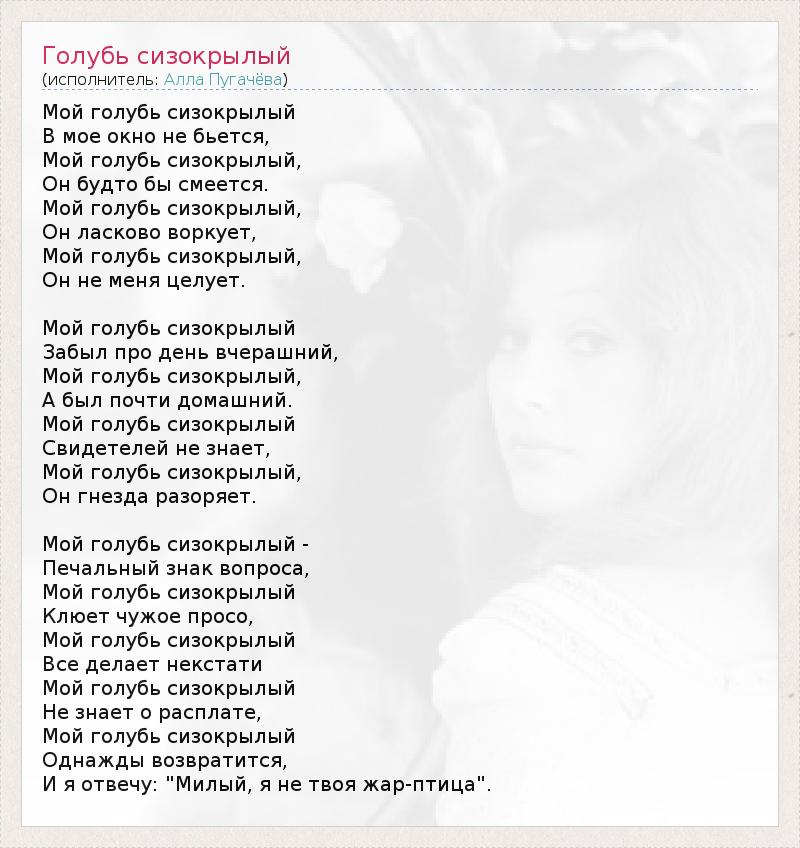 ГлавнаяИсполнителиАлла ПугачёваГолубь сизокрылый
