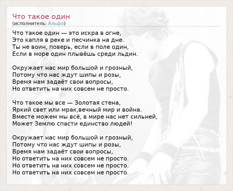 Что такое один — это искра в огне, Это капля в реке и песчинка на дне. Ты не воин, поверь, если в поле один, Если в море один плывёшь среди льдин. Окружает нас мир большой и грозный, Потому что нас ждут шипы и розы, Время нам задаёт свои вопросы, Но ответить на них совсем не просто. Что такое мы все — Золотая стена, Яркий свет или мрак,вечный мир и война. Вместе можем мы всё, в мире нас нет сильней, Может Землю спасти единство людей! Окружает нас мир большой и грозный, Потому что нас ждут шипы и розы, Время нам задаёт свои вопросы, Но ответить на них совсем не просто. Но ответить на них совсем не просто. Но ответить на них совсем не просто.