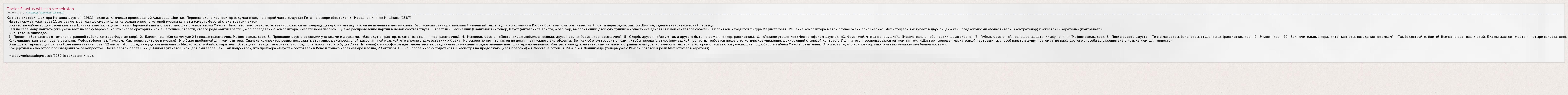 Кантата «История доктора Иоганна Фауста» (1983) – одно из ключевых произведений Альфреда Шнитке.  Первоначально композитор задумал оперу по второй части «Фауста» Гете, но вскоре обратился к «Народной книге» И. Шписа (1587).