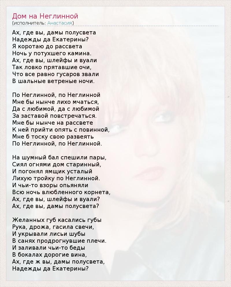 Ах, где вы, дамы полусвета Надежды да Екатерины? Я коротаю до рассвета Ночь у потухшего камина. Ах, где вы, шлейфы и вуали Так ловко прятавшие очи, Что все равно гусаров звали В шальные ветреные ночи. По Неглинной, по Неглинной Мне бы нынче лихо мчаться, Да с любимой, да с любимой За заставой повстречаться. Мне бы нынче на рассвете К ней прийти опять с повинной, Мне б тоску свою развеять По Неглинной, по Неглинной. На шумный бал спешили пары, Сиял огнями дом старинный, И погонял ямщик усталый Лихую тройку по Неглинной. И чьи-то взоры опьяняли Всю ночь влюбленного корнета, Ах, где вы, шлейфы и вуали? Ах, где вы, дамы полусвета? Желанных губ касались губы Рука, дрожа, гасила свечи, И укрывали лисьи шубы В санях продрогнувшие плечи. И заливали чьи-то беды В бокалах дорогие вина, Ах, где ж вы, дамы полусвета, Надежды да Екатерины?