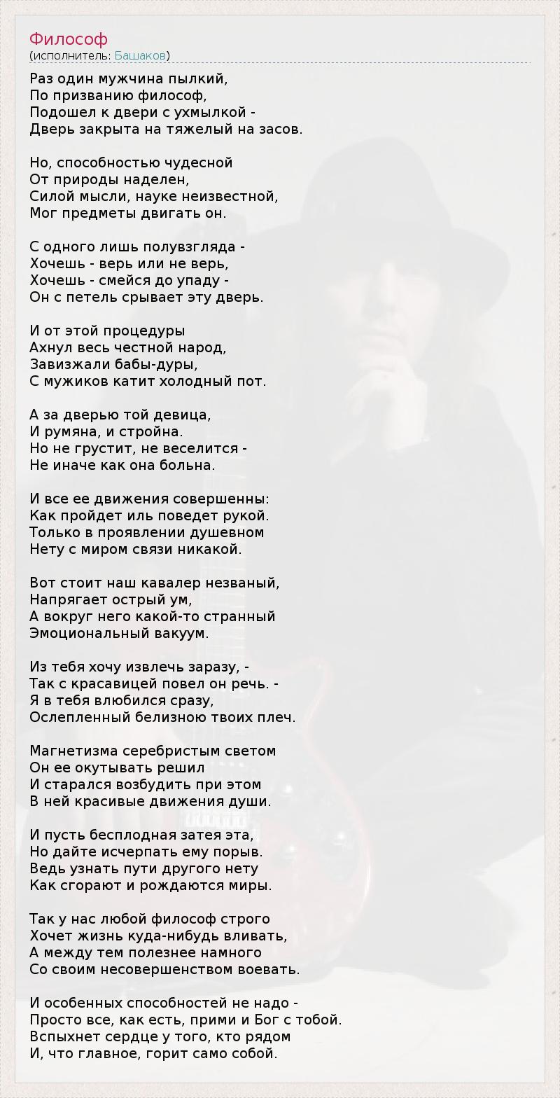 Раз один мужчина пылкий, По призванию философ, Подошел к двери с ухмылкой - Дверь закрыта на тяжелый на засов. Но, способностью чудесной От природы наделен, Силой мысли, науке неизвестной, Мог предметы двигать он. С одного лишь полувзгляда - Хочешь - верь или не верь, Хочешь - смейся до упаду - Он с петель срывает эту дверь. И от этой процедуры Ахнул весь честной народ, Завизжали бабы-дуры, С мужиков катит холодный пот. А за дверью той девица, И румяна, и стройна. Но не грустит, не веселится - Не иначе как она больна. И все ее движения совершенны: Как пройдет иль поведет рукой. Только в проявлении душевном Нету с миром связи никакой. Вот стоит наш кавалер незваный, Напрягает острый ум, А вокруг него какой-то странный Эмоциональный вакуум. Из тебя хочу извлечь заразу, - Так с красавицей повел он речь. - Я в тебя влюбился сразу, Ослепленный белизною твоих плеч. Магнетизма серебристым светом Он ее окутывать решил И старался возбудить при этом В ней красивые движения души. И пусть бесплодная затея эта, Но дайте исчерпать ему порыв. Ведь узнать пути другого нету Как сгорают и рождаются миры. Так у нас любой философ строго Хочет жизнь куда-нибудь вливать, А между тем полезнее намного Со своим несовершенством воевать. И особенных способностей не надо - Просто все, как есть, прими и Бог с тобой. Вспыхнет сердце у того, кто рядом И, что главное, горит само собой.