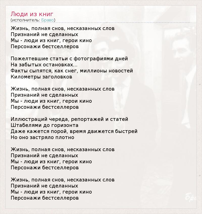 Жизнь, полная снов, несказанных слов Признаний не сделанных Мы - люди из книг, герои кино Персонажи бестселлеров Пожелтевшие статьи с фотографиями дней На забытых остановках... Факты сыпятся, как снег, миллионы новостей Километры заголовков Жизнь, полная снов, несказанных слов Признаний не сделанных Мы - люди из книг, герои кино Персонажи бестселлеров Иллюстраций череда, репортажей и статей Штабелями до горизонта Даже кажется порой, время движется быстрей Но оно застряло плотно Жизнь, полная снов, несказанных слов Признаний не сделанных Мы - люди из книг, герои кино Персонажи бестселлеров Жизнь, полная снов, несказанных слов Признаний не сделанных Мы - люди из книг, герои кино Персонажи бестселлеров