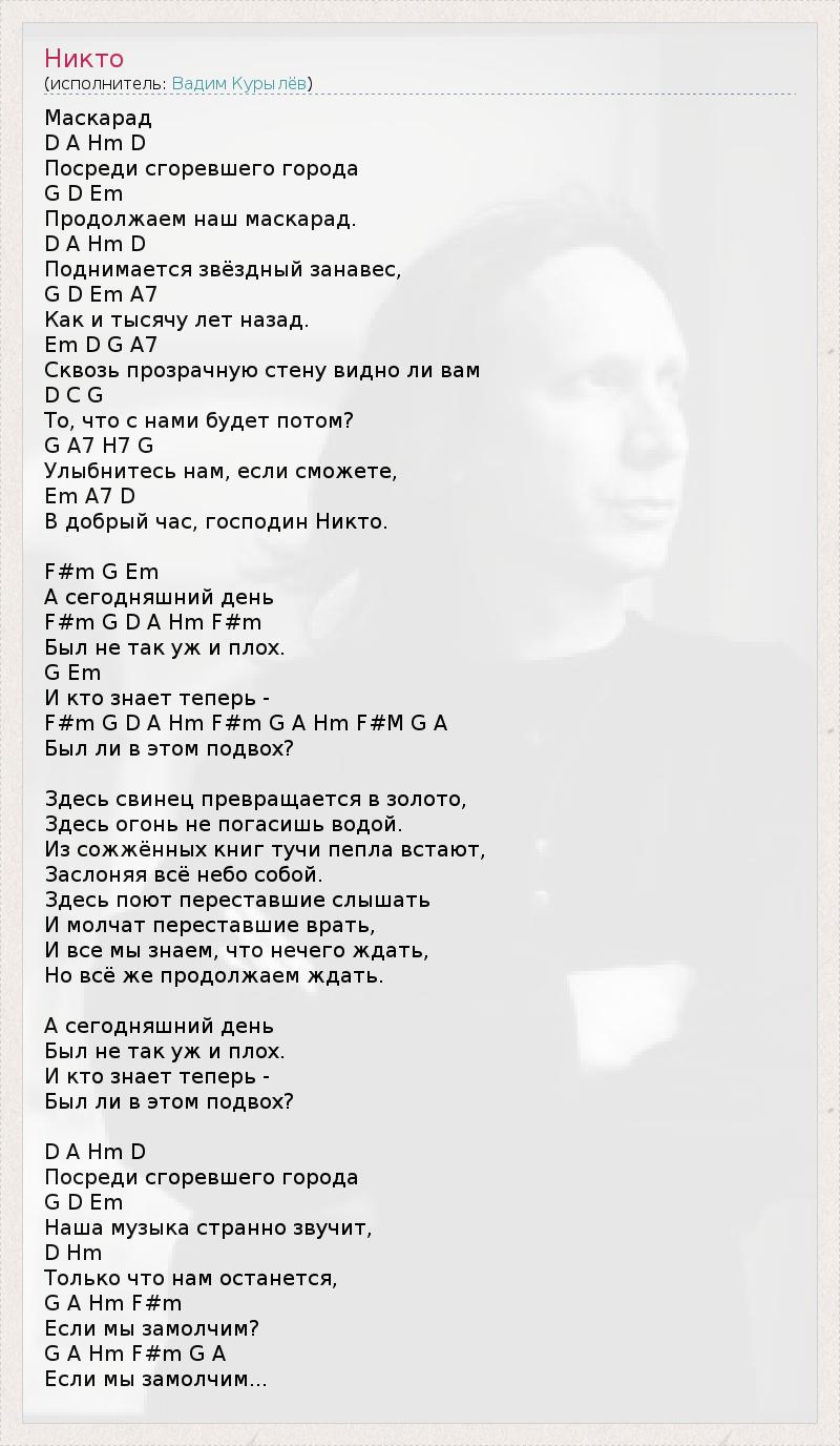 Маскарад D А Hm D Посреди сгоревшего города G D Em Продолжаем наш маскарад. D A Hm D Поднимается звёздный занавес, G D Em A7 Как и тысячу лет назад. Em D G A7 Сквозь прозрачную стену видно ли вам D C G То, что с нами будет потом? G A7 H7 G Улыбнитесь нам, если сможете, Em A7 D В добрый час, господин Никто. F#m G Em А сегодняшний день F#m G D A Hm F#m Был не так уж и плох. G Em И кто знает теперь - F#m G D A Hm F#m G A Hm F#M G A Был ли в этом подвох? Здесь свинец превращается в золото, Здесь огонь не погасишь водой. Из сожжённых книг тучи пепла встают, Заслоняя всё небо собой. Здесь поют переставшие слышать И молчат переставшие врать, И все мы знаем, что нечего ждать, Но всё же продолжаем ждать. А сегодняшний день Был не так уж и плох. И кто знает теперь - Был ли в этом подвох? D A Hm D Посреди сгоревшего города G D Em Наша музыка странно звучит, D Hm Только что нам останется, G A Hm F#m Если мы замолчим? G A Hm F#m G A Если мы замолчим...