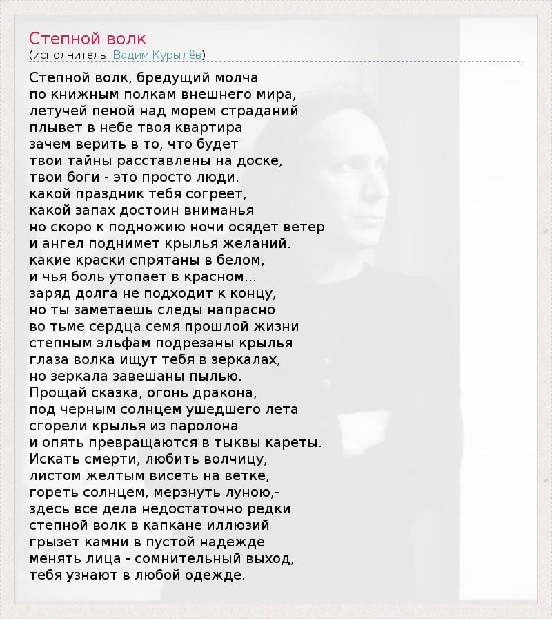 Степной волк, бредущий молча по книжным полкам внешнего мира, летучей пеной над морем страданий плывет в небе твоя квартира зачем верить в то, что будет твои тайны расставлены на доске, твои боги - это просто люди. какой праздник тебя согреет, какой запах достоин вниманья но скоро к подножию ночи осядет ветер и ангел поднимет крылья желаний. какие краски спрятаны в белом, и чья боль утопает в красном... заряд долга не подходит к концу, но ты заметаешь следы напрасно во тьме сердца семя прошлой жизни степным эльфам подрезаны крылья глаза волка ищут тебя в зеркалах, но зеркала завешаны пылью. Прощай сказка, огонь дракона, под черным солнцем ушедшего лета сгорели крылья из паролона и опять превращаются в тыквы кареты. Искать смерти, любить волчицу, листом желтым висеть на ветке, гореть солнцем, мерзнуть луною,- здесь все дела недостаточно редки степной волк в капкане иллюзий грызет камни в пустой надежде менять лица - сомнительный выход, тебя узнают в любой одежде.