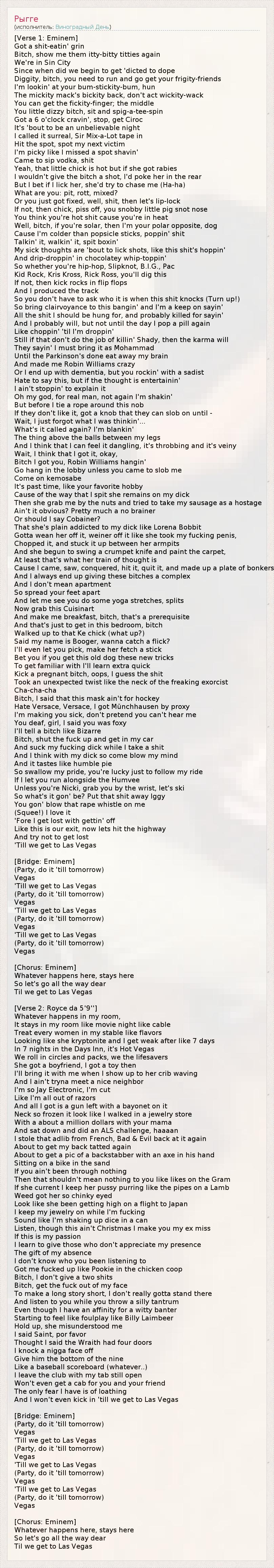 8 – Эминем перечисляет различных музыкантов: Slipknot (группа), Rick Ross (рэпер), 2Pac и B.I.G. (знаменитейшие рэперы, которые почитаются даже после их смерти), Kris Kross (рэп-группа, известные своим ношением одежды наоборот). Эм говорит, что не нужно быть его фанатом, чтобы тебе понравилась вечеринка в Лас-Вегасе.