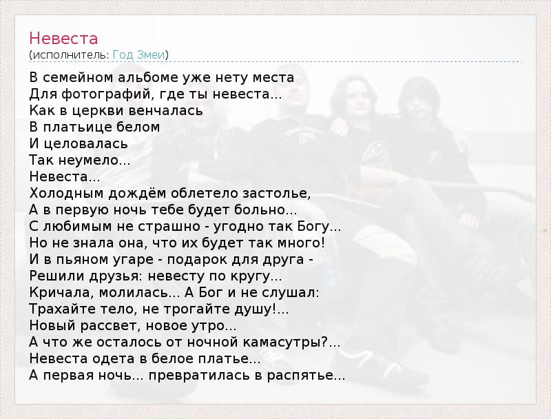 В семейном альбоме уже нету места Для фотографий, где ты невеста... Как в церкви венчалась В платьице белом И целовалась Так неумело... Невеста... Холодным дождём облетело застолье, А в первую ночь тебе будет больно... С любимым не страшно - угодно так Богу... Но не знала она, что их будет так много! И в пьяном угаре - подарок для друга - Решили друзья: невесту по кругу... Кричала, молилась... А Бог и не слушал: Трахайте тело, не трогайте душу!... Новый рассвет, новое утро... А что же осталось от ночной камасутры?... Невеста одета в белое платье... А первая ночь... превратилась в распятье...