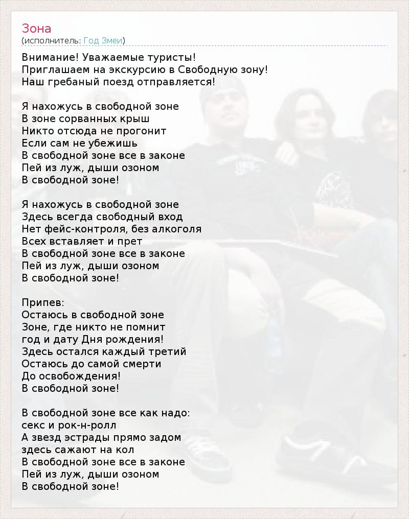 Внимание! Уважаемые туристы! Приглашаем на экскурсию в Свободную зону! Наш гребаный поезд отправляется! Я нахожусь в свободной зоне В зоне сорванных крыш Никто отсюда не прогонит Если сам не убежишь В свободной зоне все в законе Пей из луж, дыши озоном В свободной зоне! Я нахожусь в свободной зоне Здесь всегда свободный вход Нет фейс-контроля, без алкоголя Всех вставляет и прет В свободной зоне все в законе Пей из луж, дыши озоном В свободной зоне! Припев: Остаюсь в свободной зоне Зоне, где никто не помнит год и дату Дня рождения! Здесь остался каждый третий Остаюсь до самой смерти До освобождения! В свободной зоне! В свободной зоне все как надо: секс и рок-н-ролл А звезд эстрады прямо задом здесь сажают на кол В свободной зоне все в законе Пей из луж, дыши озоном В свободной зоне!