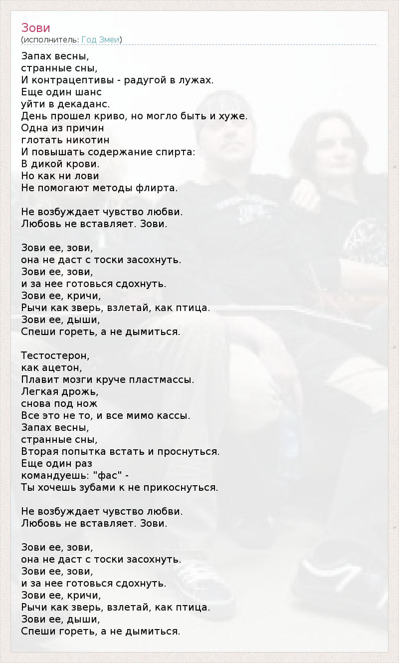 Запах весны, странные сны, И контрацептивы - радугой в лужах. Еще один шанс уйти в декаданс. День прошел криво, но могло быть и хуже. Одна из причин глотать никотин И повышать содержание спирта: В дикой крови. Но как ни лови Не помогают методы флирта. Не возбуждает чувство любви. Любовь не вставляет. Зови. Зови ее, зови, она не даст с тоски засохнуть. Зови ее, зови, и за нее готовься сдохнуть. Зови ее, кричи, Рычи как зверь, взлетай, как птица. Зови ее, дыши, Спеши гореть, а не дымиться. Тестостерон, как ацетон, Плавит мозги круче пластмассы. Легкая дрожь, снова под нож Все это не то, и все мимо кассы. Запах весны, странные сны, Вторая попытка встать и проснуться. Еще один раз командуешь: "фас" - Ты хочешь зубами к не прикоснуться. Не возбуждает чувство любви. Любовь не вставляет. Зови. Зови ее, зови, она не даст с тоски засохнуть. Зови ее, зови, и за нее готовься сдохнуть. Зови ее, кричи, Рычи как зверь, взлетай, как птица. Зови ее, дыши, Спеши гореть, а не дымиться.