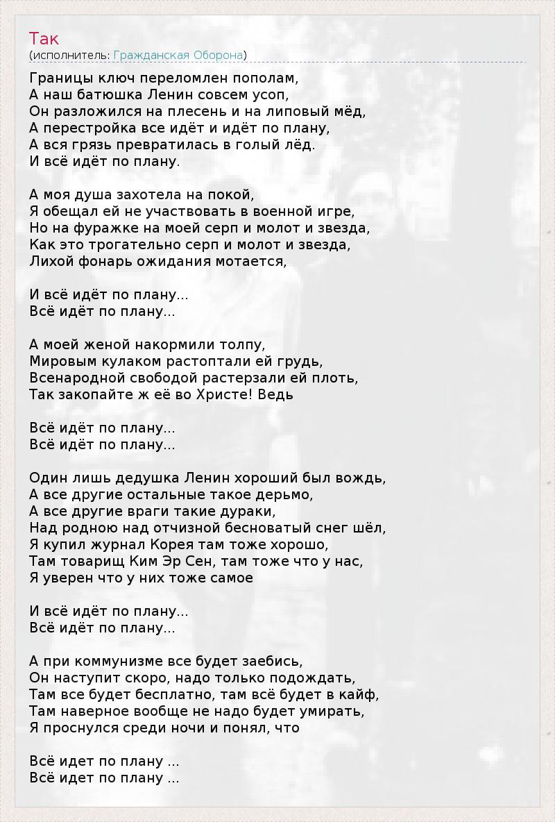 Границы ключ переломлен пополам, А наш батюшка Ленин совсем усоп, Он разложился на плесень и на липовый мёд, А перестройка все идёт и идёт по плану, А вся грязь превратилась в голый лёд. И всё идёт по плану. А моя душа захотела на покой, Я обещал ей не участвовать в военной игре, Но на фуражке на моей серп и молот и звезда, Как это трогательно серп и молот и звезда, Лихой фонарь ожидания мотается, И всё идёт по плану... Всё идёт по плану... А моей женой накормили толпу, Мировым кулаком растоптали ей грудь, Всенародной свободой растерзали ей плоть, Так закопайте ж её во Христе! Ведь Всё идёт по плану... Всё идёт по плану... Один лишь дедушка Ленин хороший был вождь, А все другие остальные такое дерьмо, А все другие враги такие дураки, Над родною над отчизной бесноватый снег шёл, Я купил журнал Корея там тоже хорошо, Там товарищ Ким Эр Сен, там тоже что у нас, Я уверен что у них тоже самое И всё идёт по плану... Всё идёт по плану... А при коммунизме все будет заебись, Он наступит скоро, надо только подождать, Там все будет бесплатно, там всё будет в кайф, Там наверное вообще не надо будет умирать, Я проснулся среди ночи и понял, что Всё идет по плану ... Всё идет по плану ...