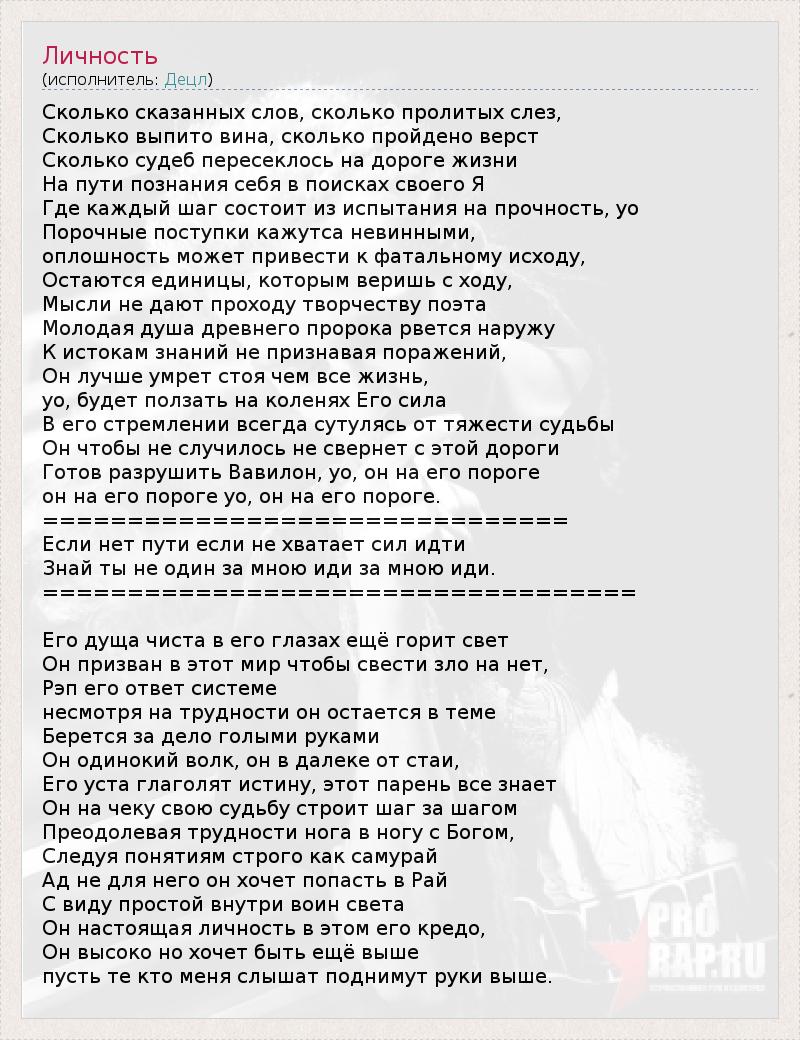 Сколько сказанных слов, сколько пролитых слез, Сколько выпито вина, сколько пройдено верст Сколько судеб пересеклось на дороге жизни На пути познания себя в поисках своего Я Где каждый шаг состоит из испытания на прочность, yo Порочные поступки кажутса невинными, оплошность может привести к фатальному исходу, Остаются единицы, которым веришь с ходу, Мысли не дают проходу творчеству поэта Молодая душа древнего пророка рвется наружу К истокам знаний не признавая поражений, Он лучше умрет стоя чем все жизнь, yo, будет ползать на коленях Его сила В его стремлении всегда сутулясь от тяжести судьбы Он чтобы не случилось не свернет с этой дороги Готов разрушить Вавилон, yo, он на его пороге он на его пороге yo, он на его пороге. =============================== Если нет пути если не хватает сил идти Знай ты не один за мною иди за мною иди. =================================== Его дуща чиста в его глазах ещё горит свет Он призван в этот мир чтобы свести зло на нет, Рэп его ответ системе несмотря на трудности он остается в теме Берется за дело голыми руками Он одинокий волк, он в далеке от стаи, Его уста глаголят истину, этот парень все знает Он на чеку свою судьбу строит шаг за шагом Преодолевая трудности нога в ногу с Богом, Следуя понятиям строго как самурай Ад не для него он хочет попасть в Рай С виду простой внутри воин света Он настоящая личность в этом его кредо, Он высоко но хочет быть ещё выше пусть те кто меня слышат поднимут руки выше.