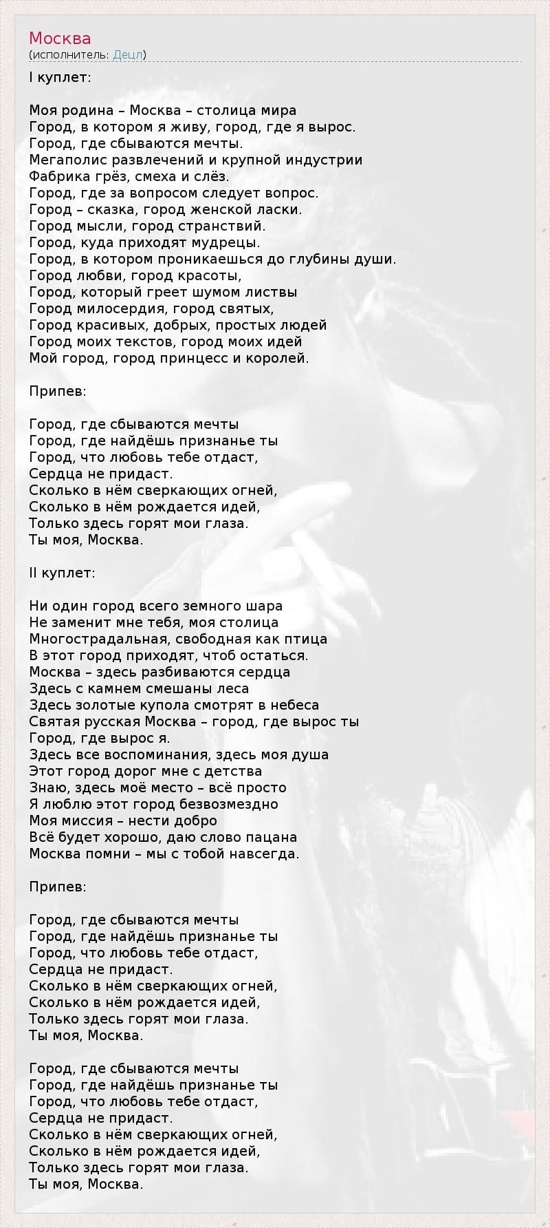 I куплет: Моя родина – Москва – столица мира Город, в котором я живу, город, где я вырос. Город, где сбываются мечты. Мегаполис развлечений и крупной индустрии Фабрика грёз, смеха и слёз. Город, где за вопросом следует вопрос. Город – сказка, город женской ласки. Город мысли, город странствий. Город, куда приходят мудрецы. Город, в котором проникаешься до глубины души. Город любви, город красоты, Город, который греет шумом листвы Город милосердия, город святых, Город красивых, добрых, простых людей Город моих текстов, город моих идей Мой город, город принцесс и королей. Припев: Город, где сбываются мечты Город, где найдёшь признанье ты Город, что любовь тебе отдаст, Сердца не придаст. Сколько в нём сверкающих огней, Сколько в нём рождается идей, Только здесь горят мои глаза. Ты моя, Москва. II куплет: Ни один город всего земного шара Не заменит мне тебя, моя столица Многострадальная, свободная как птица В этот город приходят, чтоб остаться. Москва – здесь разбиваются сердца Здесь с камнем смешаны леса Здесь золотые купола смотрят в небеса Святая русская Москва – город, где вырос ты Город, где вырос я. Здесь все воспоминания, здесь моя душа Этот город дорог мне с детства Знаю, здесь моё место – всё просто Я люблю этот город безвозмездно Моя миссия – нести добро Всё будет хорошо, даю слово пацана Москва помни – мы с тобой навсегда. Припев: Город, где сбываются мечты Город, где найдёшь признанье ты Город, что любовь тебе отдаст, Сердца не придаст. Сколько в нём сверкающих огней, Сколько в нём рождается идей, Только здесь горят мои глаза. Ты моя, Москва. Город, где сбываются мечты Город, где найдёшь признанье ты Город, что любовь тебе отдаст, Сердца не придаст. Сколько в нём сверкающих огней, Сколько в нём рождается идей, Только здесь горят мои глаза. Ты моя, Москва.