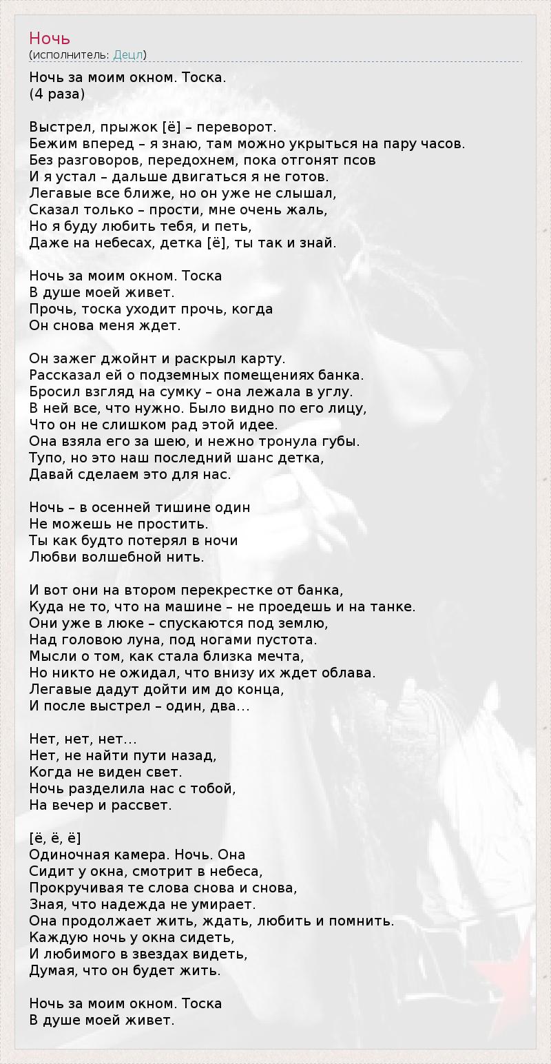 Ночь за моим окном. Тоска. (4 раза) Выстрел, прыжок [ё] – переворот. Бежим вперед – я знаю, там можно укрыться на пару часов. Без разговоров, передохнем, пока отгонят псов И я устал – дальше двигаться я не готов. Легавые все ближе, но он уже не слышал, Сказал только – прости, мне очень жаль, Но я буду любить тебя, и петь, Даже на небесах, детка [ё], ты так и знай. Ночь за моим окном. Тоска В душе моей живет. Прочь, тоска уходит прочь, когда Он снова меня ждет. Он зажег джойнт и раскрыл карту. Рассказал ей о подземных помещениях банка. Бросил взгляд на сумку – она лежала в углу. В ней все, что нужно. Было видно по его лицу, Что он не слишком рад этой идее. Она взяла его за шею, и нежно тронула губы. Тупо, но это наш последний шанс детка, Давай сделаем это для нас. Ночь – в осенней тишине один Не можешь не простить. Ты как будто потерял в ночи Любви волшебной нить. И вот они на втором перекрестке от банка, Куда не то, что на машине – не проедешь и на танке. Они уже в люке – спускаются под землю, Над головою луна, под ногами пустота. Мысли о том, как стала близка мечта, Но никто не ожидал, что внизу их ждет облава. Легавые дадут дойти им до конца, И после выстрел – один, два… Нет, нет, нет… Нет, не найти пути назад, Когда не виден свет. Ночь разделила нас с тобой, На вечер и рассвет. [ё, ё, ё] Одиночная камера. Ночь. Она Сидит у окна, смотрит в небеса, Прокручивая те слова снова и снова, Зная, что надежда не умирает. Она продолжает жить, ждать, любить и помнить. Каждую ночь у окна сидеть, И любимого в звездах видеть, Думая, что он будет жить. Ночь за моим окном. Тоска В душе моей живет.