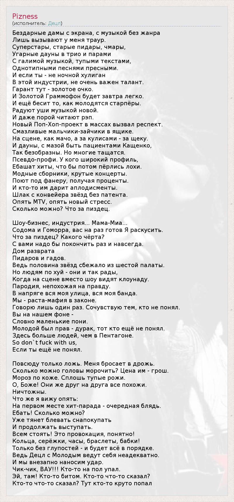 Это интересно:Биография самого известного децыла страны – Кирилла Толмацкого, более известного как Децл Aka Le Truk, в свое время по-разному подавалась всевозможными СМИ, но всегда пестрела расхождениями и противоречиями. Между тем, с самого начала история Децла не только как артиста, но, прежде всего, как личности, представляет собой искусно запутанный клубок, и Кириллу пришлось положить несколько... продолжение