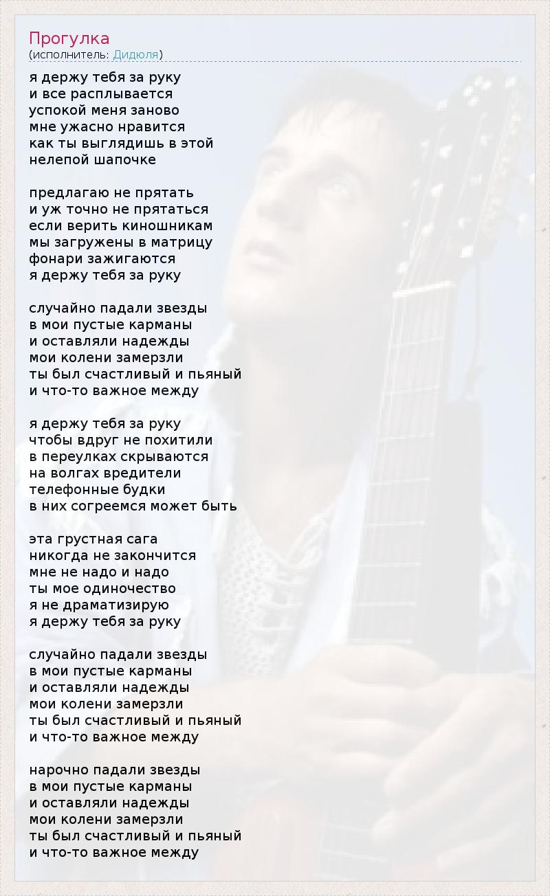 я держу тебя за руку и все расплывается успокой меня заново мне ужасно нравится как ты выглядишь в этой нелепой шапочке предлагаю не прятать и уж точно не прятаться если верить киношникам мы загружены в матрицу фонари зажигаются я держу тебя за руку случайно падали звезды в мои пустые карманы и оставляли надежды мои колени замерзли ты был счастливый и пьяный и что-то важное между я держу тебя за руку чтобы вдруг не похитили в переулках скрываются на волгах вредители телефонные будки в них согреемся может быть эта грустная сага никогда не закончится мне не надо и надо ты мое одиночество я не драматизирую я держу тебя за руку случайно падали звезды в мои пустые карманы и оставляли надежды мои колени замерзли ты был счастливый и пьяный и что-то важное между нарочно падали звезды в мои пустые карманы и оставляли надежды мои колени замерзли ты был счастливый и пьяный и что-то важное между