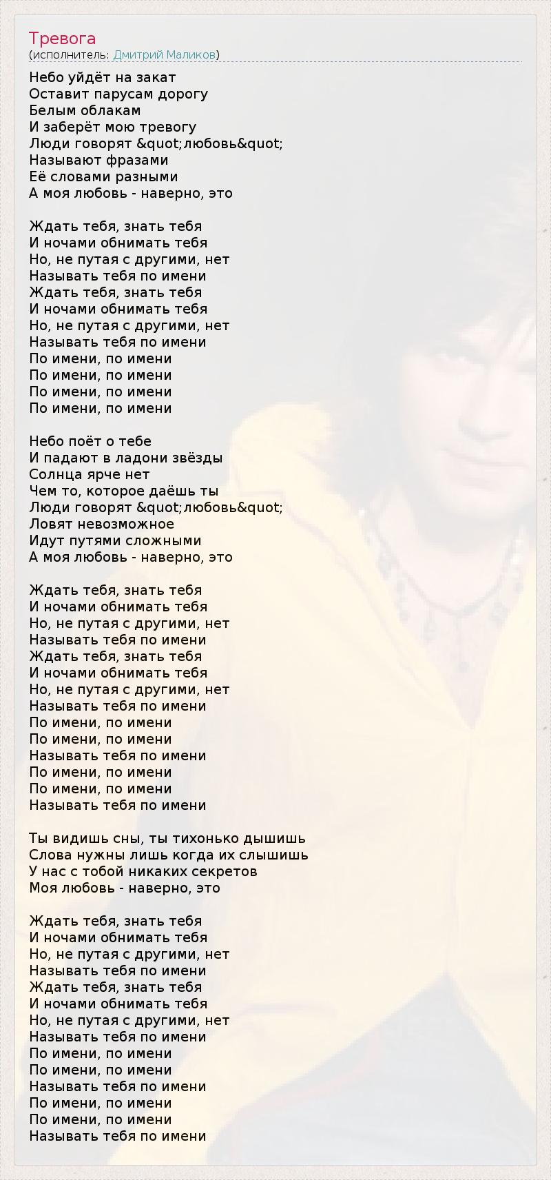 Небо уйдёт на закат Оставит парусам дорогу Белым облакам И заберёт мою тревогу Люди говорят "любовь" Называют фразами Её словами разными А моя любовь - наверно, это Ждать тебя, знать тебя И ночами обнимать тебя Но, не путая с другими, нет Называть тебя по имени Ждать тебя, знать тебя И ночами обнимать тебя Но, не путая с другими, нет Называть тебя по имени По имени, по имени По имени, по имени По имени, по имени По имени, по имени Небо поёт о тебе И падают в ладони звёзды Солнца ярче нет Чем то, которое даёшь ты Люди говорят "любовь" Ловят невозможное Идут путями сложными А моя любовь - наверно, это Ждать тебя, знать тебя И ночами обнимать тебя Но, не путая с другими, нет Называть тебя по имени Ждать тебя, знать тебя И ночами обнимать тебя Но, не путая с другими, нет Называть тебя по имени По имени, по имени По имени, по имени Называть тебя по имени По имени, по имени По имени, по имени Называть тебя по имени Ты видишь сны, ты тихонько дышишь Слова нужны лишь когда их слышишь У нас с тобой никаких секретов Моя любовь - наверно, это Ждать тебя, знать тебя И ночами обнимать тебя Но, не путая с другими, нет Называть тебя по имени Ждать тебя, знать тебя И ночами обнимать тебя Но, не путая с другими, нет Называть тебя по имени По имени, по имени По имени, по имени Называть тебя по имени По имени, по имени По имени, по имени Называть тебя по имени