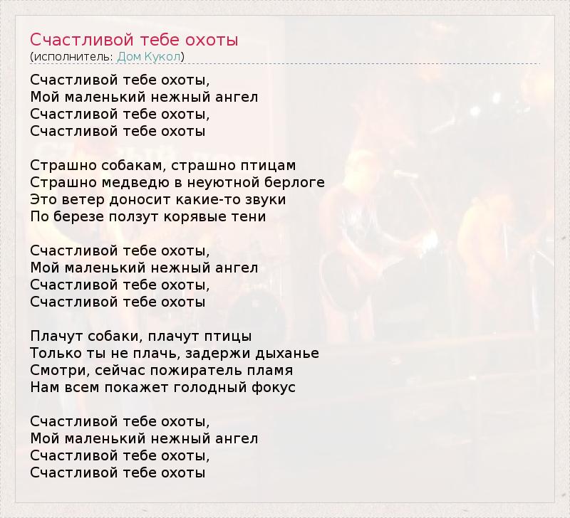 Счастливой тебе охоты, Мой маленький нежный ангел Счастливой тебе охоты, Счастливой тебе охоты Страшно собакам, страшно птицам Страшно медведю в неуютной берлоге Это ветер доносит какие-то звуки По березе ползут корявые тени Счастливой тебе охоты, Мой маленький нежный ангел Счастливой тебе охоты, Счастливой тебе охоты Плачут собаки, плачут птицы Только ты не плачь, задержи дыханье Смотри, сейчас пожиратель пламя Нам всем покажет голодный фокус Счастливой тебе охоты, Мой маленький нежный ангел Счастливой тебе охоты, Счастливой тебе охоты