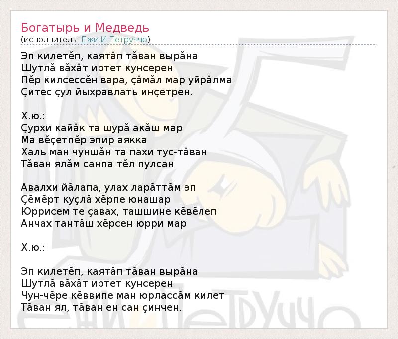 Ep kiletĕp , kayatăp tăvan vyrăna Shutlă văhăt irtet kunseren Pĕr kilsessĕn vara , çămăl March uyrălma Çites çul yyhravlat inçetren . H.yu .: Çurhi kayăk that shură akăsh March Ma vĕçetpĕr Epirus ayakka Hal Mann chunshăn that Pahi myc - tăvan Tăvan yalăm SAUV tĕl pulsan Avalhi yălapa , Ulah larăttăm ep Çĕmĕrt kuçlă hĕrpe yunashar Yurrisem those çavah , tashshine kĕvĕlep Anchah tantăsh hĕrsen Urry March H.yu .: Ep kiletĕp , kayatăp tăvan vyrăna Shutlă văhăt irtet kunseren Chun - chĕre kĕvvipe Mans yurlassăm kilet Tăvan yawl , tăvan en san çinchen .