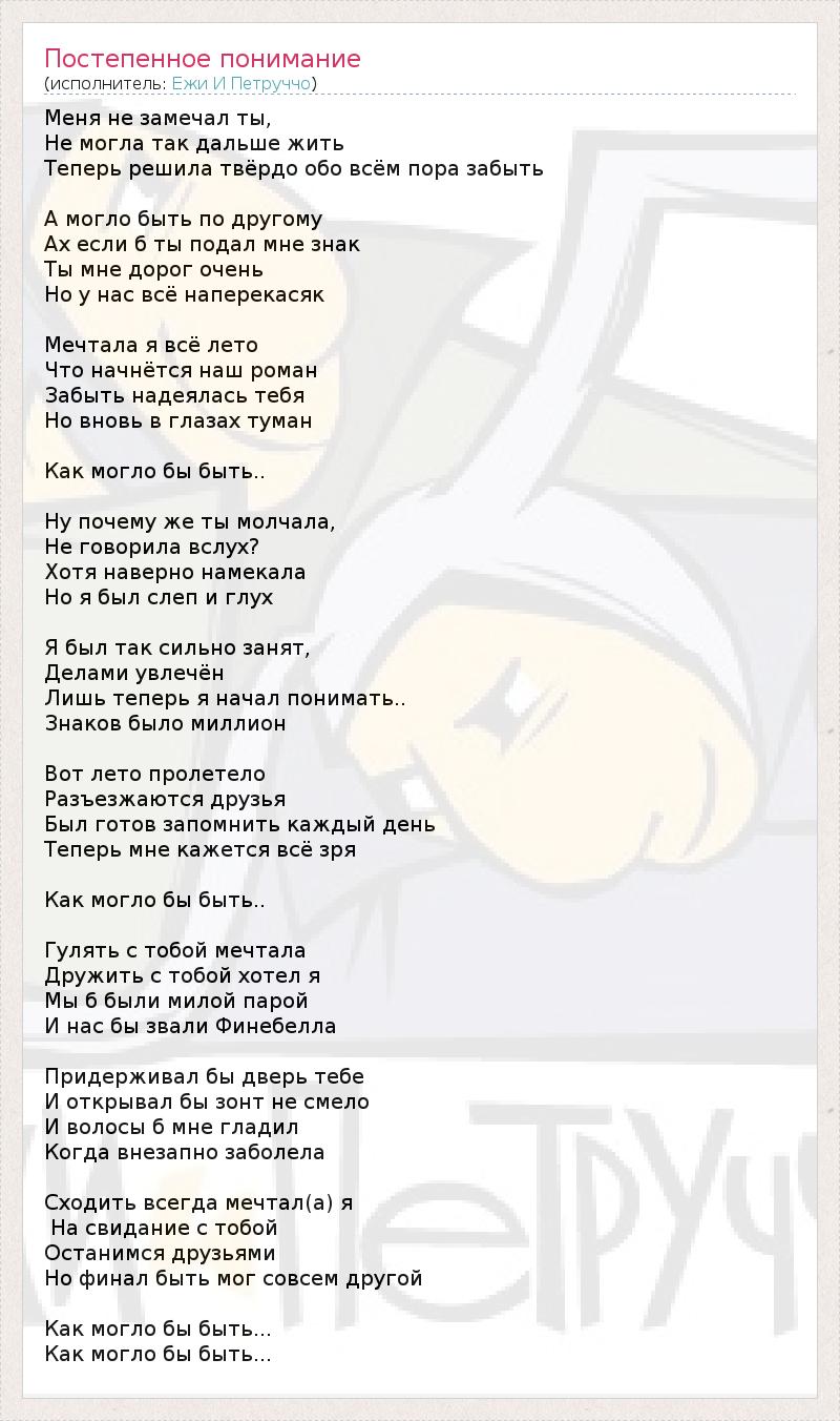 Меня не замечал ты, Не могла так дальше жить Теперь решила твёрдо обо всём пора забыть А могло быть по другому Ах если б ты подал мне знак Ты мне дорог очень Но у нас всё наперекасяк Мечтала я всё лето Что начнётся наш роман Забыть надеялась тебя Но вновь в глазах туман Как могло бы быть.. Ну почему же ты молчала, Не говорила вслух? Хотя наверно намекала Но я был слеп и глух Я был так сильно занят, Делами увлечён Лишь теперь я начал понимать.. Знаков было миллион Вот лето пролетело Разъезжаются друзья Был готов запомнить каждый день Теперь мне кажется всё зря Как могло бы быть.. Гулять с тобой мечтала Дружить с тобой хотел я Мы б были милой парой И нас бы звали Финебелла Придерживал бы дверь тебе И открывал бы зонт не смело И волосы б мне гладил Когда внезапно заболела Сходить всегда мечтал(а) я На свидание с тобой Останимся друзьями Но финал быть мог совсем другой Как могло бы быть... Как могло бы быть...