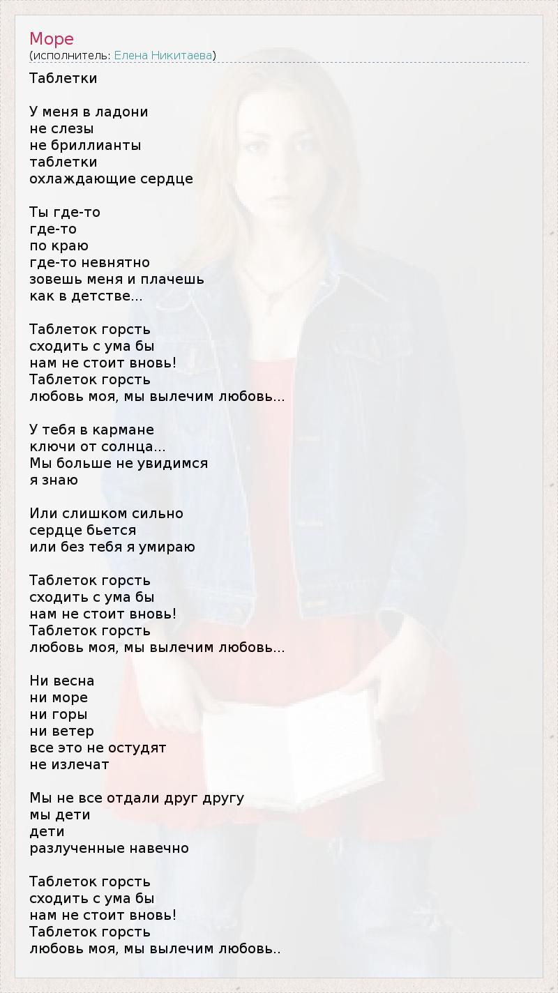 Таблетки У меня в ладони не слезы не бриллианты таблетки охлаждающие сердце Ты где-то где-то по краю где-то невнятно зовешь меня и плачешь как в детстве... Таблеток горсть сходить с ума бы нам не стоит вновь! Таблеток горсть любовь моя, мы вылечим любовь... У тебя в кармане ключи от солнца... Мы больше не увидимся я знаю Или слишком сильно сердце бьется или без тебя я умираю Таблеток горсть сходить с ума бы нам не стоит вновь! Таблеток горсть любовь моя, мы вылечим любовь... Ни весна ни море ни горы ни ветер все это не остудят не излечат Мы не все отдали друг другу мы дети дети разлученные навечно Таблеток горсть сходить с ума бы нам не стоит вновь! Таблеток горсть любовь моя, мы вылечим любовь..