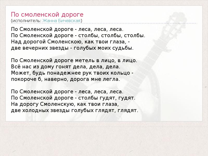 По Смоленской дороге - леса, леса, леса. По Смоленской дороге - столбы, столбы, столбы. Над дорогой Смоленскою, как твои глаза, - две вечерних звезды - голубых моих судьбы. По Смоленской дороге метель в лицо, в лицо. Всё нас из дому гонят дела, дела, дела. Может, будь понадежнее рук твоих кольцо - покороче б, наверно, дорога мне легла. По Смоленской дороге - леса, леса, леса. По Смоленской дороге - столбы гудят, гудят. На дорогу Смоленскую, как твои глаза, две холодных звезды голубых глядят, глядят.