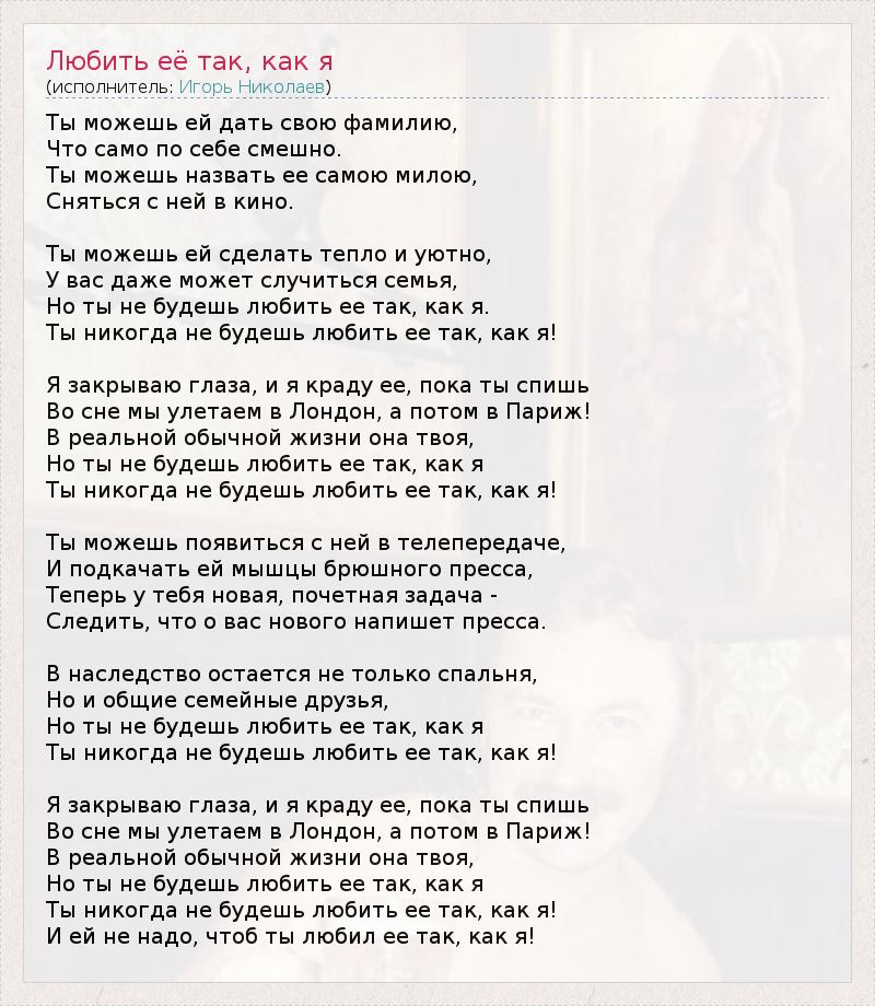 Ты можешь ей дать свою фамилию, Что само по себе смешно. Ты можешь назвать ее самою милою, Сняться с ней в кино. Ты можешь ей сделать тепло и уютно, У вас даже может случиться семья, Но ты не будешь любить ее так, как я. Ты никогда не будешь любить ее так, как я! Я закрываю глаза, и я краду ее, пока ты спишь Во сне мы улетаем в Лондон, а потом в Париж! В реальной обычной жизни она твоя, Но ты не будешь любить ее так, как я Ты никогда не будешь любить ее так, как я! Ты можешь появиться с ней в телепередаче, И подкачать ей мышцы брюшного пресса, Теперь у тебя новая, почетная задача - Следить, что о вас нового напишет пресса. В наследство остается не только спальня, Но и общие семейные друзья, Но ты не будешь любить ее так, как я Ты никогда не будешь любить ее так, как я! Я закрываю глаза, и я краду ее, пока ты спишь Во сне мы улетаем в Лондон, а потом в Париж! В реальной обычной жизни она твоя, Но ты не будешь любить ее так, как я Ты никогда не будешь любить ее так, как я! И ей не надо, чтоб ты любил ее так, как я!