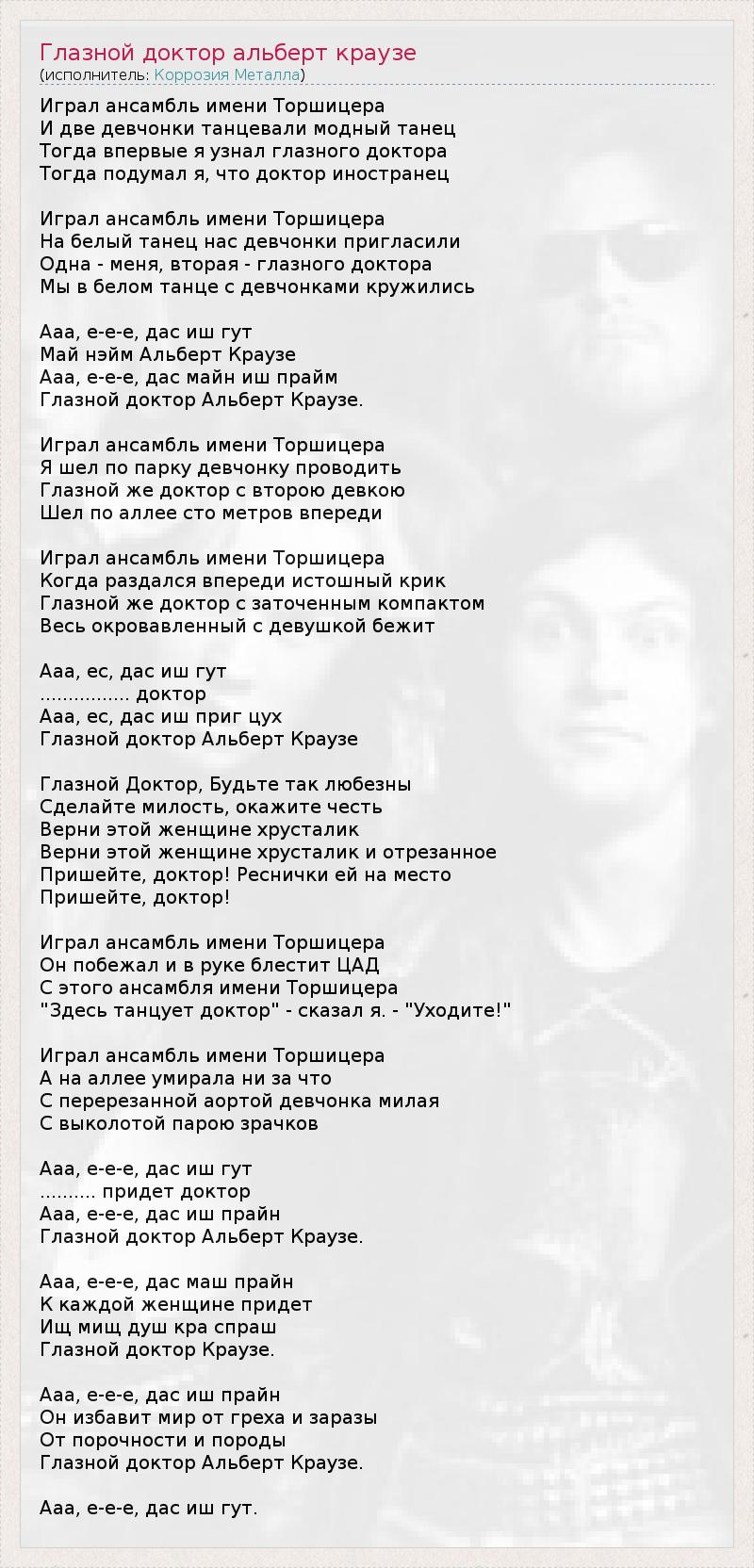 А как ты думаешь, о чем песня "Глазной доктор альберт краузе" ?