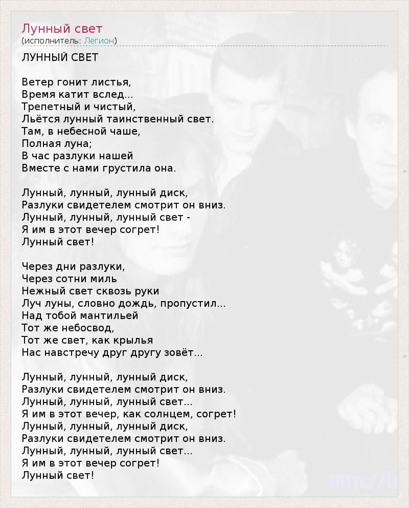 Легион - Лунный свет http://megalyrics.ru/lyric/%D0%BB%D0%B5%D0%B3%D0%B8%D0%BE%D0%BD/%D0%BB%D1%83%D0%BD%D0%BD%D1%8B%D0%B9-%D1%81%D0%B2%D0%B5%D1%82.htm#ixzz1xxj5pRBN