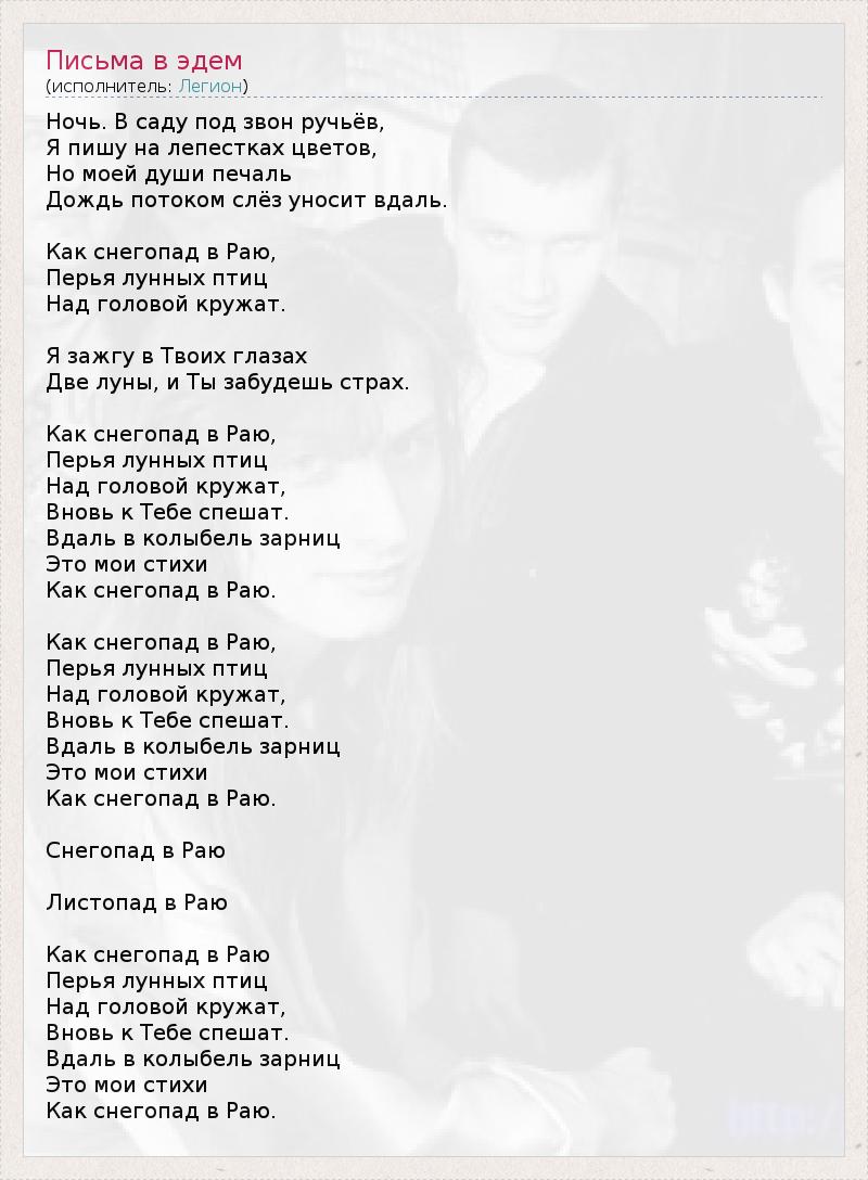 Легион - Письма в Эдем http://megalyrics.ru/lyric/%D0%BB%D0%B5%D0%B3%D0%B8%D0%BE%D0%BD/%D0%BF%D0%B8%D1%81%D1%8C%D0%BC%D0%B0-%D0%B2-%D1%8D%D0%B4%D0%B5%D0%BC.htm#ixzz1xxjTbiIM