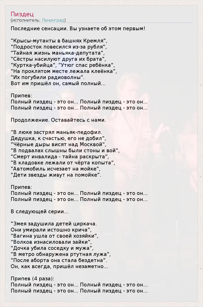 Это интересно:Оф. сайт | Facebook | YouTube | Twitter | ВКонтакте | iTunes Группу «Ленинград» правильней было бы определить как оркестр. Духовая секция — тромбон, саксофон, труба, туба — в сочетании с ксилофоном, гитарами, барабанами... продолжение