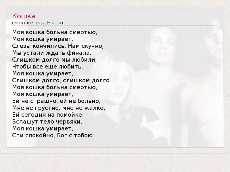 Моя кошка больна смертью, Моя кошка умирает. Слезы кончились. Нам скучно, Мы устали ждать финала. Слишком долго мы любили, Чтобы все еще любить. Моя кошка умирает, Слишком долго, слишком долго. Моя кошка больна смертью, Моя кошка умирает, Ей не страшно, ей не больно, Мне не грустно, мне не жалко, Ей сегодня на помойке Вспашут тело червяки. Моя кошка умирает, Спи спокойно, Бог с тобою