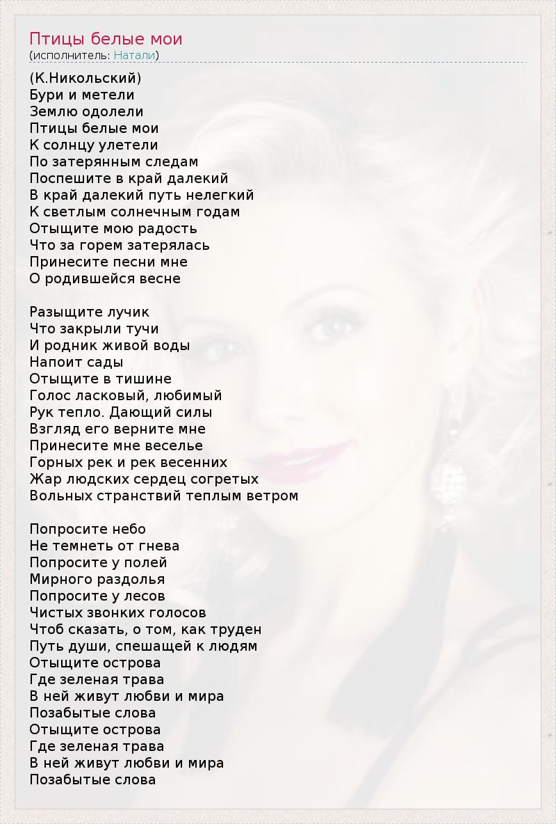 (К.Никольский) Бури и метели Землю одолели Птицы белые мои К солнцу улетели По затерянным следам Поспешите в край далекий В край далекий путь нелегкий К светлым солнечным годам Отыщите мою радость Что за горем затерялась Принесите песни мне О родившейся весне Разыщите лучик Что закрыли тучи И родник живой воды Напоит сады Отыщите в тишине Голос ласковый, любимый Рук тепло. Дающий силы Взгляд его верните мне Принесите мне веселье Горных рек и рек весенних Жар людских сердец согретых Вольных странствий теплым ветром Попросите небо Не темнеть от гнева Попросите у полей Мирного раздолья Попросите у лесов Чистых звонких голосов Чтоб сказать, о том, как труден Путь души, спешащей к людям Отыщите острова Где зеленая трава В ней живут любви и мира Позабытые слова Отыщите острова Где зеленая трава В ней живут любви и мира Позабытые слова