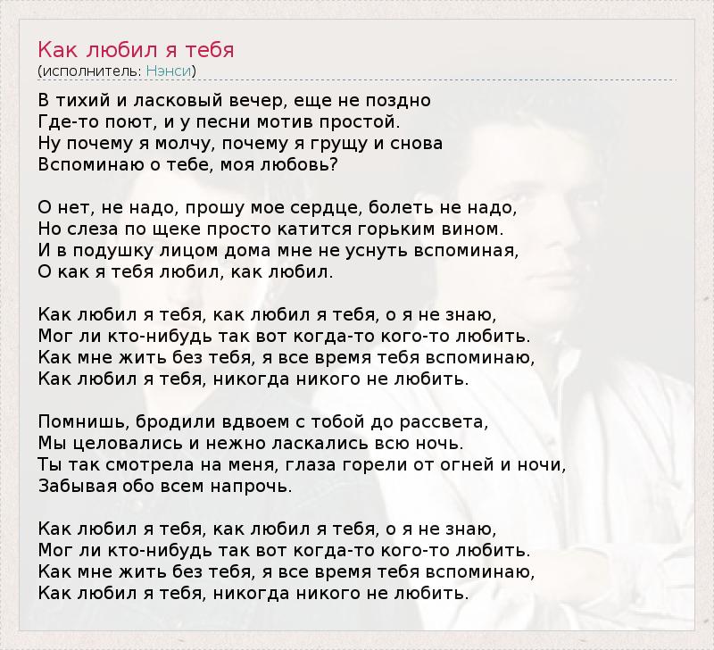 В тихий и ласковый вечер, еще не поздно Где-то поют, и у песни мотив простой. Ну почему я молчу, почему я грущу и снова Вспоминаю о тебе, моя любовь? О нет, не надо, прошу мое сердце, болеть не надо, Но слеза по щеке просто катится горьким вином. И в подушку лицом дома мне не уснуть вспоминая, О как я тебя любил, как любил. Как любил я тебя, как любил я тебя, о я не знаю, Мог ли кто-нибудь так вот когда-то кого-то любить. Как мне жить без тебя, я все время тебя вспоминаю, Как любил я тебя, никогда никого не любить. Помнишь, бродили вдвоем с тобой до рассвета, Мы целовались и нежно ласкались всю ночь. Ты так смотрела на меня, глаза горели от огней и ночи, Забывая обо всем напрочь. Как любил я тебя, как любил я тебя, о я не знаю, Мог ли кто-нибудь так вот когда-то кого-то любить. Как мне жить без тебя, я все время тебя вспоминаю, Как любил я тебя, никогда никого не любить.