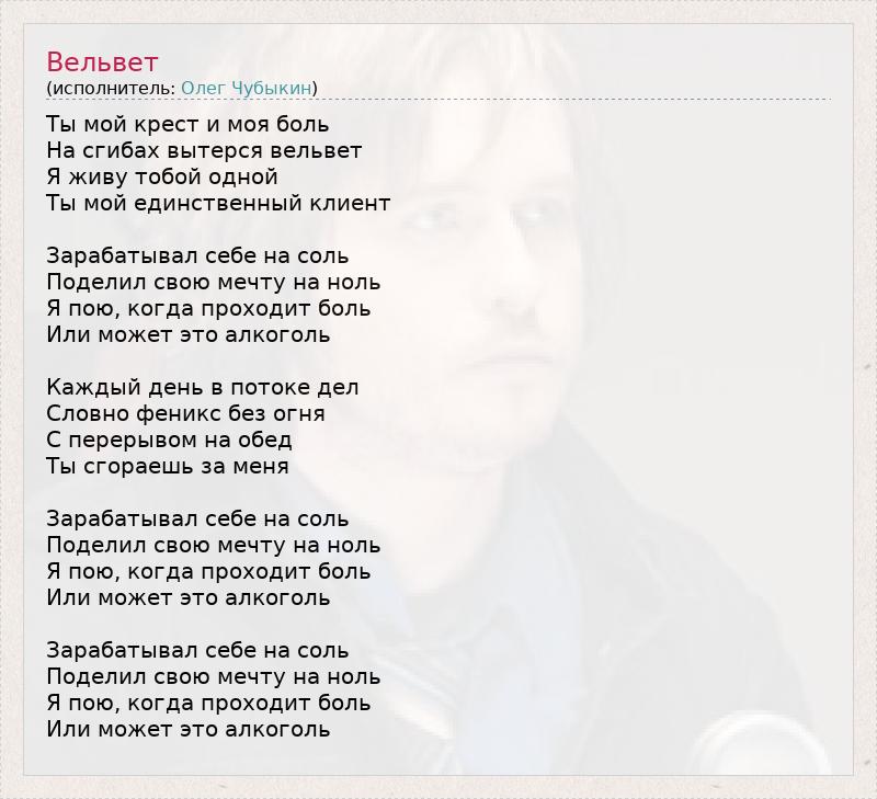 Ты мой крест и моя боль На сгибах вытерся вельвет Я живу тобой одной Ты мой единственный клиент Зарабатывал себе на соль Поделил свою мечту на ноль Я пою, когда проходит боль Или может это алкоголь Каждый день в потоке дел Словно феникс без огня С перерывом на обед Ты сгораешь за меня Зарабатывал себе на соль Поделил свою мечту на ноль Я пою, когда проходит боль Или может это алкоголь Зарабатывал себе на соль Поделил свою мечту на ноль Я пою, когда проходит боль Или может это алкоголь