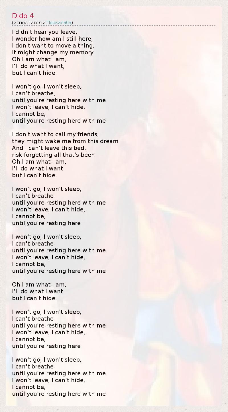 I didn't hear you leave, I wonder how am I still here, I don't want to move a thing, it might change my memory Oh I am what I am, I'll do what I want, but I can't hide I won't go, I won't sleep, I can't breathe, until you're resting here with me I won't leave, I can't hide, I cannot be, until you're resting here with me I don't want to call my friends, they might wake me from this dream And I can't leave this bed, risk forgetting all that's been Oh I am what I am, I'll do what I want but I can't hide I won't go, I won't sleep, I can't breathe until you're resting here with me I won't leave, I can't hide, I cannot be, until you're resting here I won't go, I won't sleep, I can't breathe until you're resting here with me I won't leave, I can't hide, I cannot be, until you're resting here with me Oh I am what I am, I'll do what I want but I can't hide I won't go, I won't sleep, I can't breathe until you're resting here with me I won't leave, I can't hide, I cannot be, until you're resting here I won't go, I won't sleep, I can't breathe until you're resting here with me I won't leave, I can't hide, I cannot be, until you're resting here with me