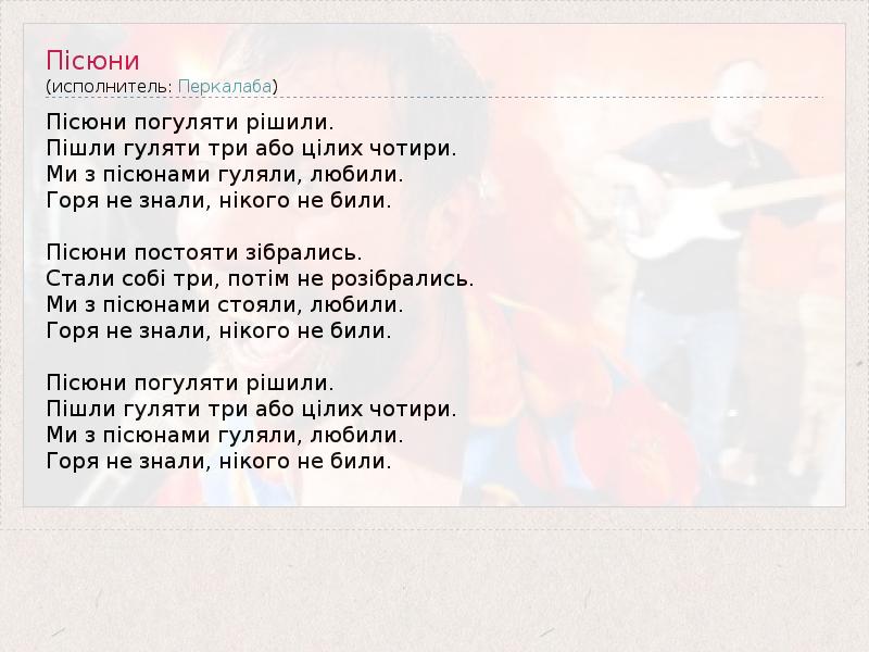 Пісюни погуляти рішили. Пішли гуляти три або цілих чотири. Ми з пісюнами гуляли, любили. Горя не знали, нікого не били. Пісюни постояти зібрались. Стали собі три, потім не розібрались. Ми з пісюнами стояли, любили. Горя не знали, нікого не били. Пісюни погуляти рішили. Пішли гуляти три або цілих чотири. Ми з пісюнами гуляли, любили. Горя не знали, нікого не били.