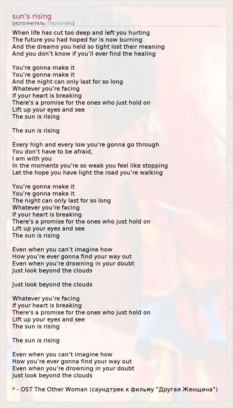 When life has cut too deep and left you hurting The future you had hoped for is now burning And the dreams you held so tight lost their meaning And you don't know if you'll ever find the healing You're gonna make it You're gonna make it And the night can only last for so long Whatever you're facing If your heart is breaking There's a promise for the ones who just hold on Lift up your eyes and see The sun is rising The sun is rising Every high and every low you're gonna go through You don't have to be afraid, I am with you In the moments you're so weak you feel like stopping Let the hope you have light the road you're walking You're gonna make it You're gonna make it The night can only last for so long Whatever you're facing If your heart is breaking There's a promise for the ones who just hold on Lift up your eyes and see The sun is rising Even when you can't imagine how How you're ever gonna find your way out Even when you're drowning in your doubt Just look beyond the clouds Just look beyond the clouds Whatever you're facing If your heart is breaking There's a promise for the ones who just hold on Lift up your eyes and see The sun is rising The sun is rising Even when you can't imagine how How you're ever gonna find your way out Even when you're drowning in your doubt Just look beyond the clouds * - OST The Other Woman (саундтрек к фильму "Другая Женщина")