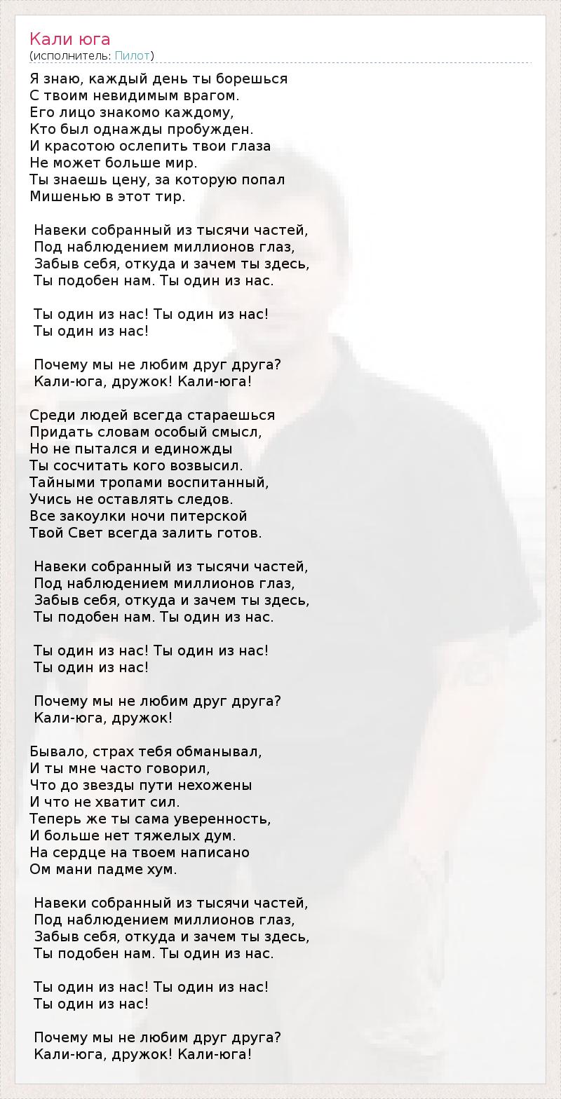 Я знаю, каждый день ты борешься С твоим невидимым врагом. Его лицо знакомо каждому, Кто был однажды пробужден. И красотою ослепить твои глаза Не может больше мир. Ты знаешь цену, за которую попал Мишенью в этот тир. Навеки собранный из тысячи частей, Под наблюдением миллионов глаз, Забыв себя, откуда и зачем ты здесь, Ты подобен нам. Ты один из нас. Ты один из нас! Ты один из нас! Ты один из нас! Почему мы не любим друг друга? Кали-юга, дружок! Кали-юга! Среди людей всегда стараешься Придать словам особый смысл, Но не пытался и единожды Ты сосчитать кого возвысил. Тайными тропами воспитанный, Учись не оставлять следов. Все закоулки ночи питерской Твой Свет всегда залить готов. Навеки собранный из тысячи частей, Под наблюдением миллионов глаз, Забыв себя, откуда и зачем ты здесь, Ты подобен нам. Ты один из нас. Ты один из нас! Ты один из нас! Ты один из нас! Почему мы не любим друг друга? Кали-юга, дружок! Бывало, страх тебя обманывал, И ты мне часто говорил, Что до звезды пути нехожены И что не хватит сил. Теперь же ты сама уверенность, И больше нет тяжелых дум. На сердце на твоем написано Ом мани падме хум. Навеки собранный из тысячи частей, Под наблюдением миллионов глаз, Забыв себя, откуда и зачем ты здесь, Ты подобен нам. Ты один из нас. Ты один из нас! Ты один из нас! Ты один из нас! Почему мы не любим друг друга? Кали-юга, дружок! Кали-юга!