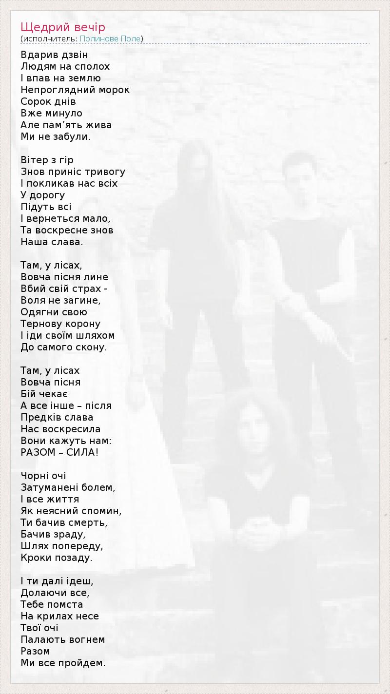 Вдарив дзвін Людям на сполох І впав на землю Непроглядний морок Сорок днів Вже минуло Але пам’ять жива Ми не забули. Вітер з гір Знов приніс тривогу І покликав нас всіх У дорогу Підуть всі І вернеться мало, Та воскресне знов Наша слава. Там, у лісах, Вовча пісня лине Вбий свій страх - Воля не загине, Одягни свою Тернову корону І іди своїм шляхом До самого скону. Там, у лісах Вовча пісня Бій чекає А все інше – після Предків слава Нас воскресила Вони кажуть нам: РАЗОМ – СИЛА! Чорні очі Затуманені болем, І все життя Як неясний спомин, Ти бачив смерть, Бачив зраду, Шлях попереду, Кроки позаду. І ти далі ідеш, Долаючи все, Тебе помста На крилах несе Твої очі Палають вогнем Разом Ми все пройдем.