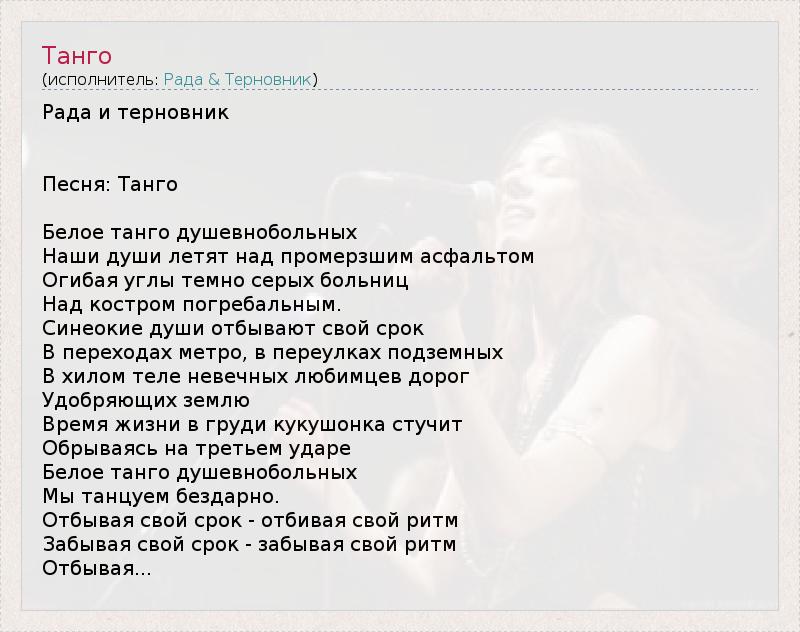 Это интересно:Группа "Рада и Терновник" образовалась 7 октября 1991 года, в день рождения Рады, выступавшей до этого сольно. Группа стала активно выступать на музыкальных фестивалях и получила известность как психоделическая команда. В 1994 году группа записывает и выпускает свой дебютный альбом «Графика». Через год выходит второй диск — «Печальные звуки». Группа экспериментирует со стилем, доходя... продолжение