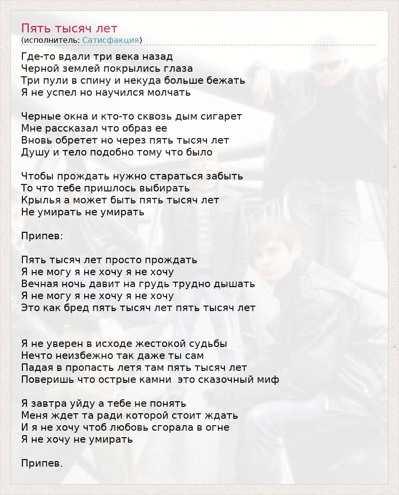 Где-то вдали три века назад Черной землей покрылись глаза Три пули в спину и некуда больше бежать Я не успел но научился молчать Черные окна и кто-то сквозь дым сигарет Мне рассказал что образ ее Вновь обретет но через пять тысяч лет Душу и тело подобно тому что было Чтобы прождать нужно стараться забыть То что тебе пришлось выбирать Крылья а может быть пять тысяч лет Не умирать не умирать Припев: Пять тысяч лет просто прождать Я не могу я не хочу я не хочу Вечная ночь давит на грудь трудно дышать Я не могу я не хочу я не хочу Это как бред пять тысяч лет пять тысяч лет Я не уверен в исходе жестокой судьбы Нечто неизбежно так даже ты сам Падая в пропасть летя там пять тысяч лет Поверишь что острые камни это сказочный миф Я завтра уйду а тебе не понять Меня ждет та ради которой стоит ждать И я не хочу чтоб любовь сгорала в огне Я не хочу не умирать Припев.