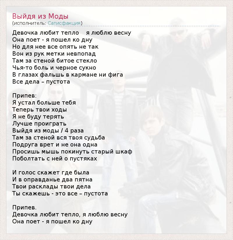 Девочка любит тепло я люблю весну Она поет - я пошел ко дну Но для нее все опять не так Вон из рук метки невпопад Там за стеной битое стекло Чья-то боль и черное сукно В глазах фальшь в кармане ни фига Все дела – пустота Припев: Я устал больше тебя Теперь твои ходы Я не буду терять Лучше проиграть Выйдя из моды / 4 раза Там за стеной вся твоя судьба Подруга врет и не она одна Просишь мышь покинуть старый шкаф Поболтать с ней о пустяках И голос скажет где была И в оправданье два пятна Твои расклады твои дела Ты скажешь - это все – пустота Припев. Девочка любит тепло, я люблю весну Она поет - я пошел ко дну