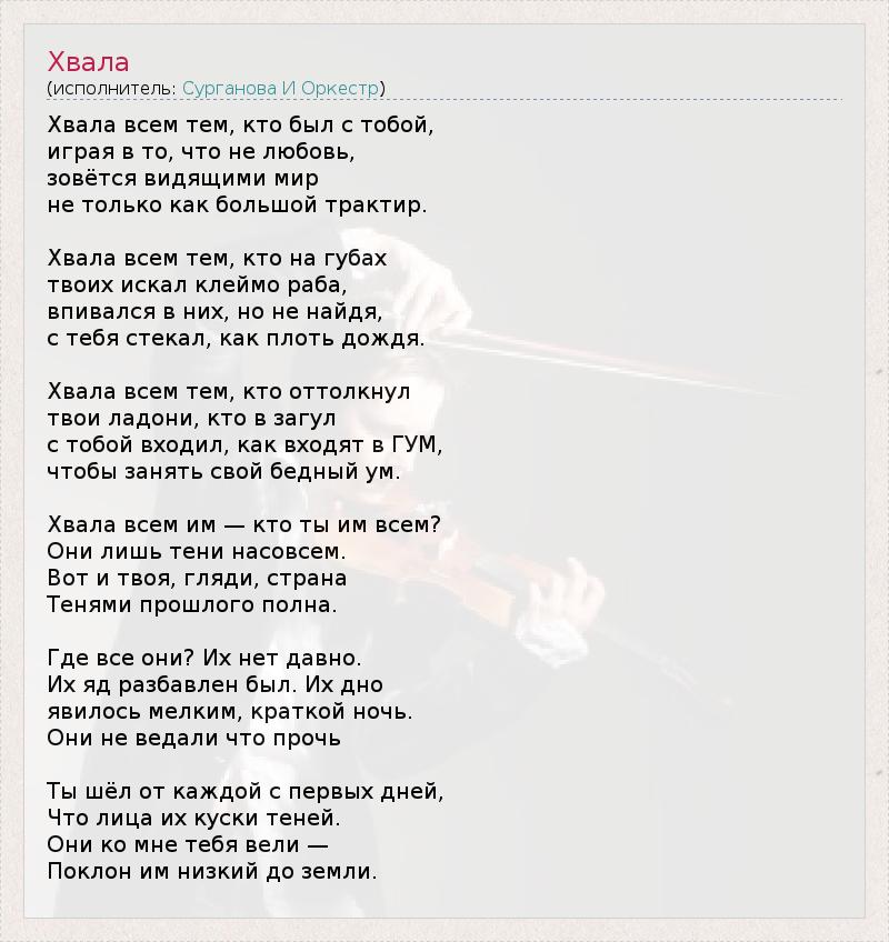 Это интересно:Пожалуйста, исправьте в тегах своих файлов название группы на правильное: Сурганова и Оркестр («и» — маленькая) для правильного сбора статистики. Спасибо!