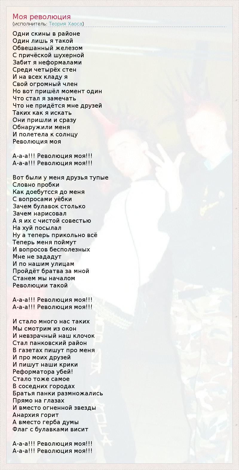 Это интересно:Группа ТЕОРИЯ ХАОСА зародилась в недрах школы 506 г. Москвы в 2001 или 2002 году. Изначально не ставилось каких-то далеко идущих планов для развития группы, просто собирались играть все подряд, на что хватало умения. Кстати, о тех кто собирался, так удачно всё сложилось что несколько человек оказались в нужном месте в нужное время. А этими людьми были: Алекс, Зелёный,... продолжение