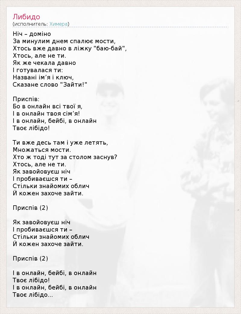 Ніч – доміно За минулим днем спалює мости, Хтось вже давно в ліжку "баю-бай", Хтось, але не ти. Як же чекала давно І готувалася ти: Названі ім’я і ключ, Сказане слово "Зайти!" Приспів: Бо в онлайн всі твої я, І в онлайн твоя сім’я! І в онлайн, бейбі, в онлайн Твоє лібідо! Ти вже десь там і уже летять, Множаться мости. Хто ж тоді тут за столом заснув? Хтось, але не ти. Як завойовуєш ніч І пробиваєшся ти – Стільки знайомих облич Й кожен захоче зайти. Приспів (2) Як завойовуєш ніч І пробиваєшся ти – Стільки знайомих облич Й кожен захоче зайти. Приспів (2) І в онлайн, бейбі, в онлайн Твоє лібідо! І в онлайн, бейбі, в онлайн Твоє лібідо...