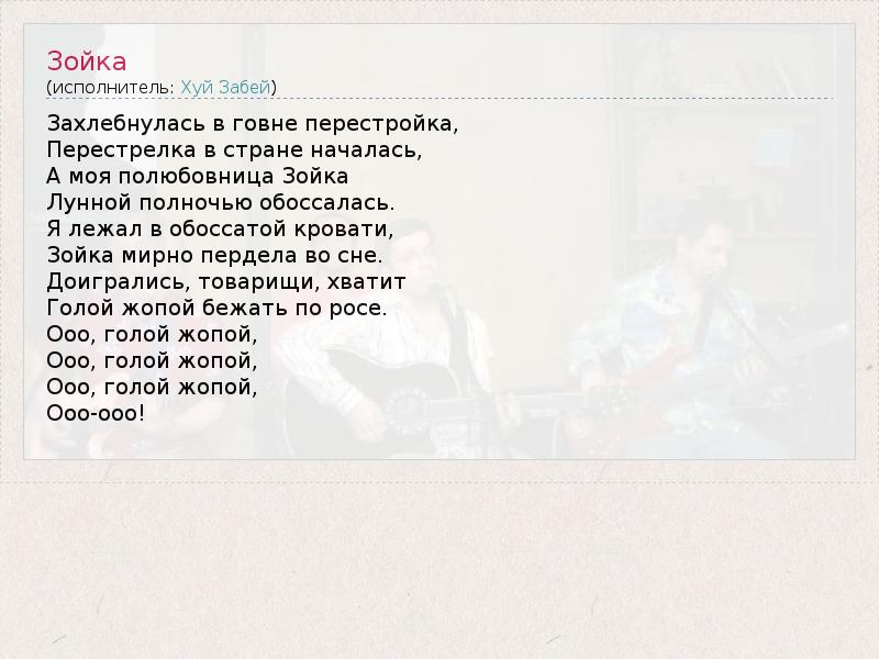Захлебнулась в говне перестройка, Перестрелка в стране началась, А моя полюбовница Зойка Лунной полночью обоссалась. Я лежал в обоссатой кровати, Зойка мирно пердела во сне. Доигрались, товарищи, хватит Голой жопой бежать по росе. Ооо, голой жопой, Ооо, голой жопой, Ооо, голой жопой, Ооо-ооо!