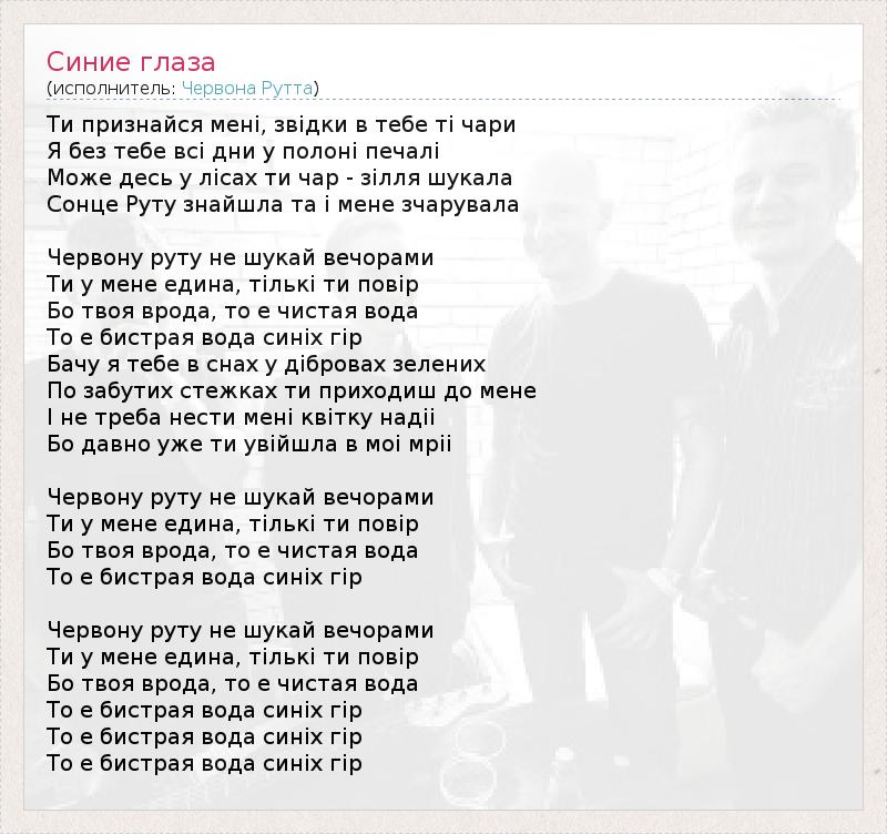 Ты признайся мне, откуда у тебя те чары Я без тебя все дни в плену печали Может где-то в лесах ты чар-зелье искала Солнце Руту нашла и она меня очаровала Червону руту не ищи вечерами Ты у меня единственная, Только ты поверь Потому что твоя красота, то есть чистая вода То е быстрая вода синих гор Вижу я тебя в снах в дубравы зеленых По забытых тропам ты приходишь ко мне I не надо нести мне цветок надii Ибо давно уже ты вошла в моi мрii Червону руту не ищи вечерами Ты у меня единственная, Только ты поверь Потому что твоя красота, то есть чистая вода То е быстрая вода синих гор Червону руту не ищи вечерами Ты у меня единственная, Только ты поверь Потому что твоя красота, то есть чистая вода То быстрая вода синих гор То быстрая вода синих гор То быстрая вода синих гор